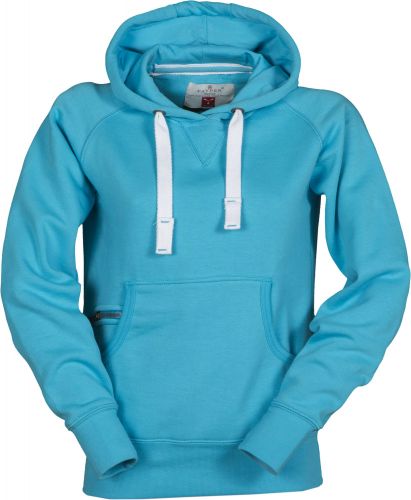 Women’s fitted hoodie with double stitched seams and white drawstring with contrasting stitching and metal rings, raglan sleeves, V-design neck stitching, kangaroo pockets, small zip pocket, stretch rib cuffs and hem, reinforced seams, 300gr/m2. Material 70% bavlna, 30% polyester.