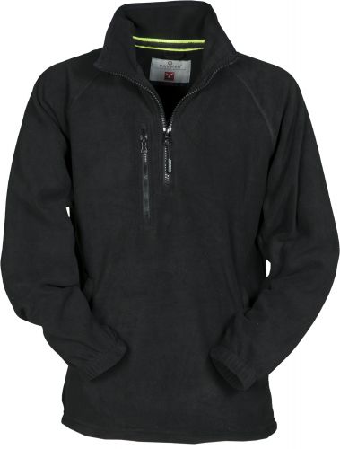 Fleece, with black plastic 8 mm half zip, raglan sleeves, adjustable drawstring at the waist, elasticated cuffs, two pockets with concealed zip, one front zip pocket, neck with contrasting reinforcement tape, reinforced seams.