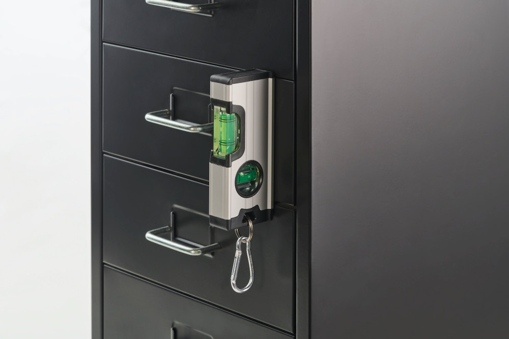 Mini magnetic double spirit level in aluminium case with carabiner. The carabiner is not for climbing (non-professional use). Dimensions: 12 x 5 x 2,2 cm