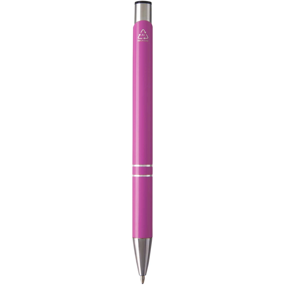 Ballpoint pen made from recycled aluminium with a lacquered finish, polished shine, and striking chrome details. Recycled aluminium reduces the amount of waste in landfills and helps to conserve natural resources aiming to reduce greenhouse emissions. Ink colour: Blue. Writing length: 1000 metres. Nib size: 1.00 mm. Dimensions: 13,6 x O 1 cm