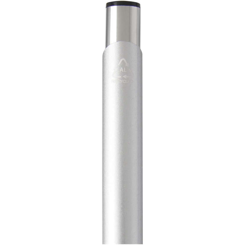 Ballpoint pen made from recycled aluminium with a lacquered finish, polished shine, and striking chrome details. Recycled aluminium reduces the amount of waste in landfills and helps to conserve natural resources aiming to reduce greenhouse emissions. Ink colour: Blue. Writing length: 1000 metres. Nib size: 1.00 mm. Dimensions: 13,6 x O 1 cm