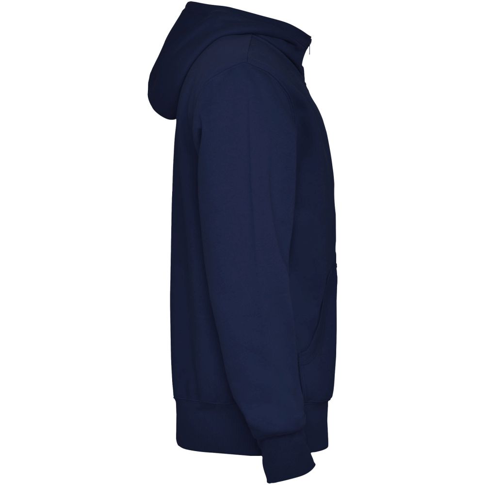 Sweat hooded jacket with high neck and full zip. Ribbed detail in hood and pocket piping. Kangaroo style pocket. 2x2 rib in cuffs and waist. Kids sizes available. Removable label. The model is 184 cm and is wearing size L.