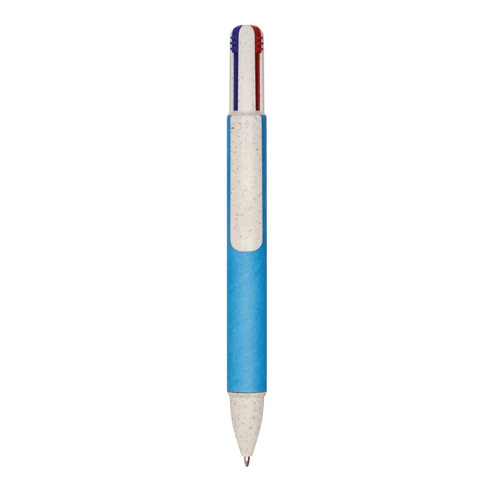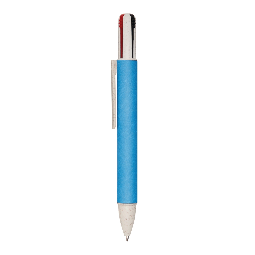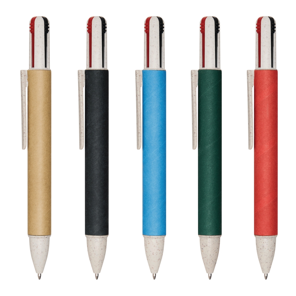Multi ballpoint pen, four colours: made of wheat straw and ABS, barrel covered in recycled carton, push mechanism, ball pen refills with black, red, blue, and red ink. Dimensions: 14,3 cm