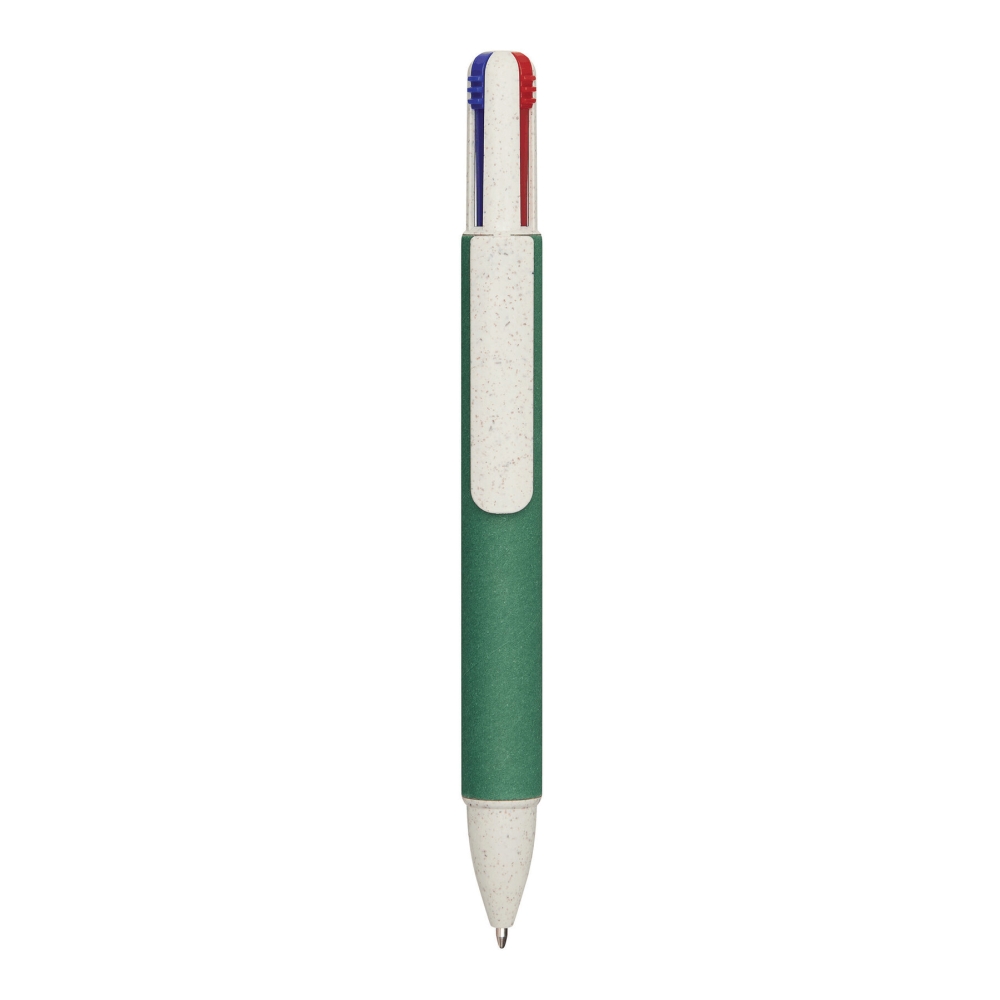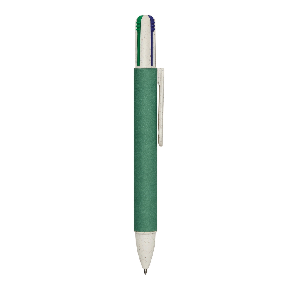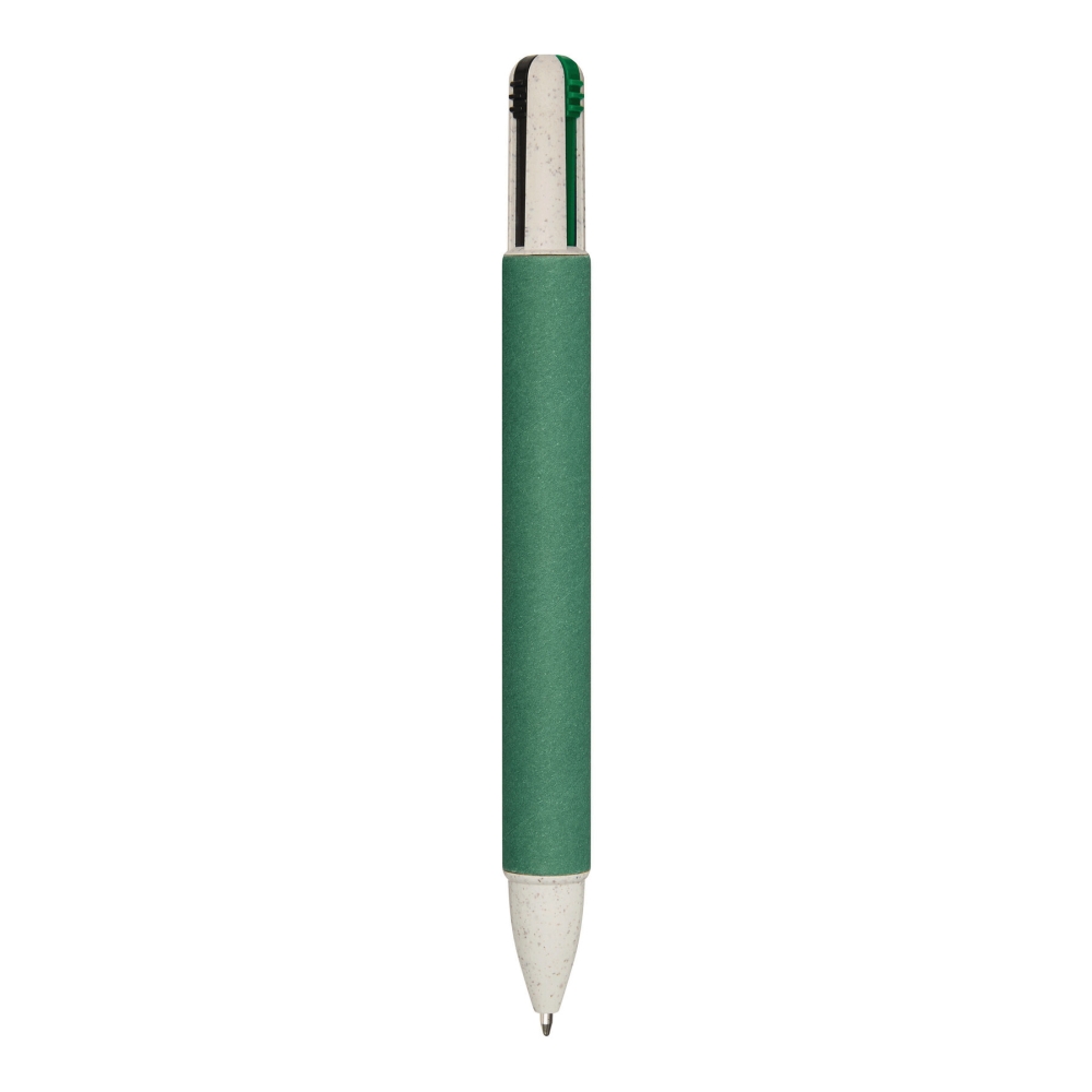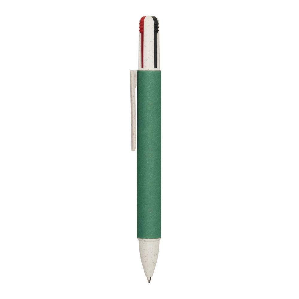 Multi ballpoint pen, four colours: made of wheat straw and ABS, barrel covered in recycled carton, push mechanism, ball pen refills with black, red, blue, and red ink. Dimensions: 14,3 cm