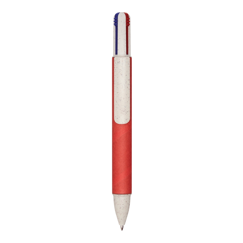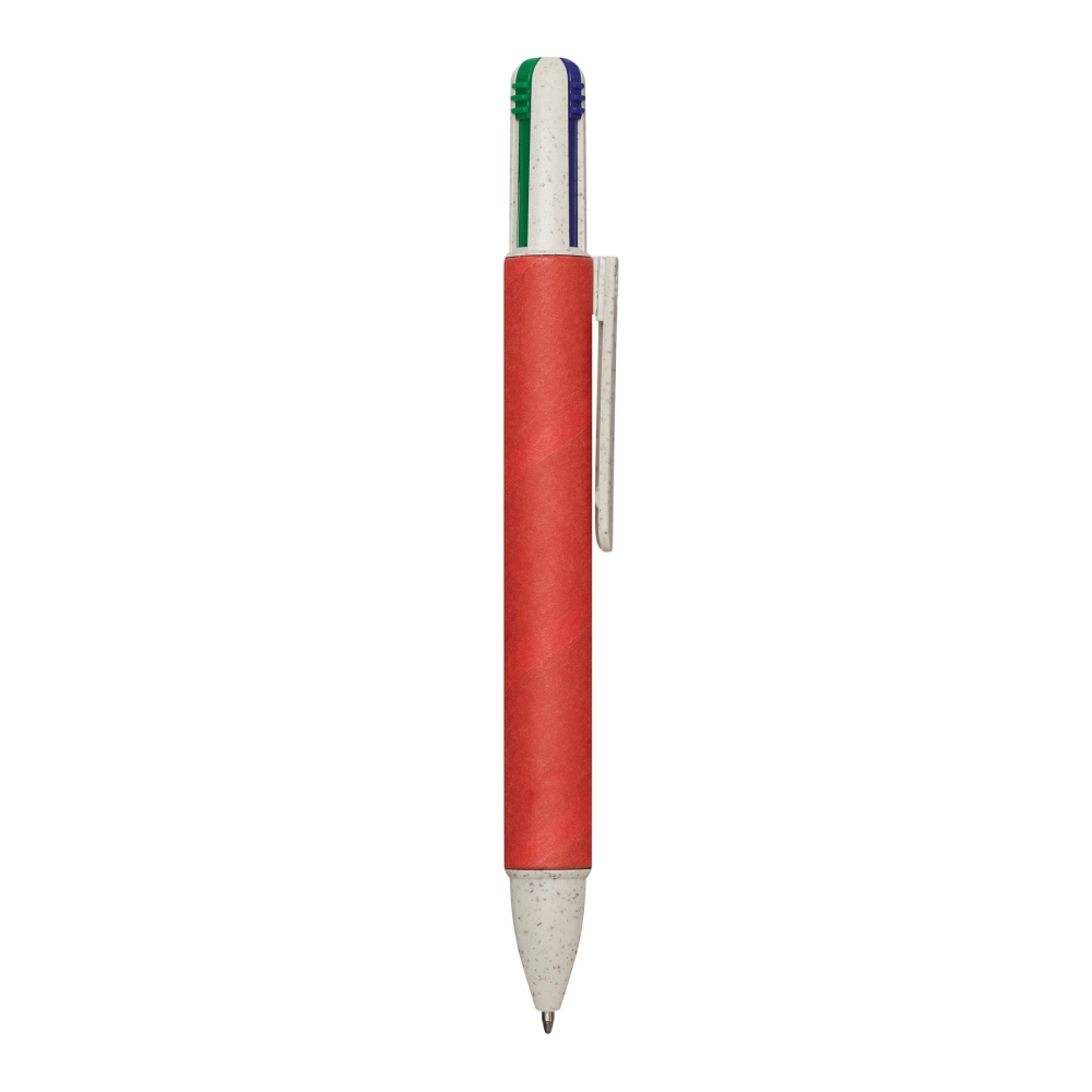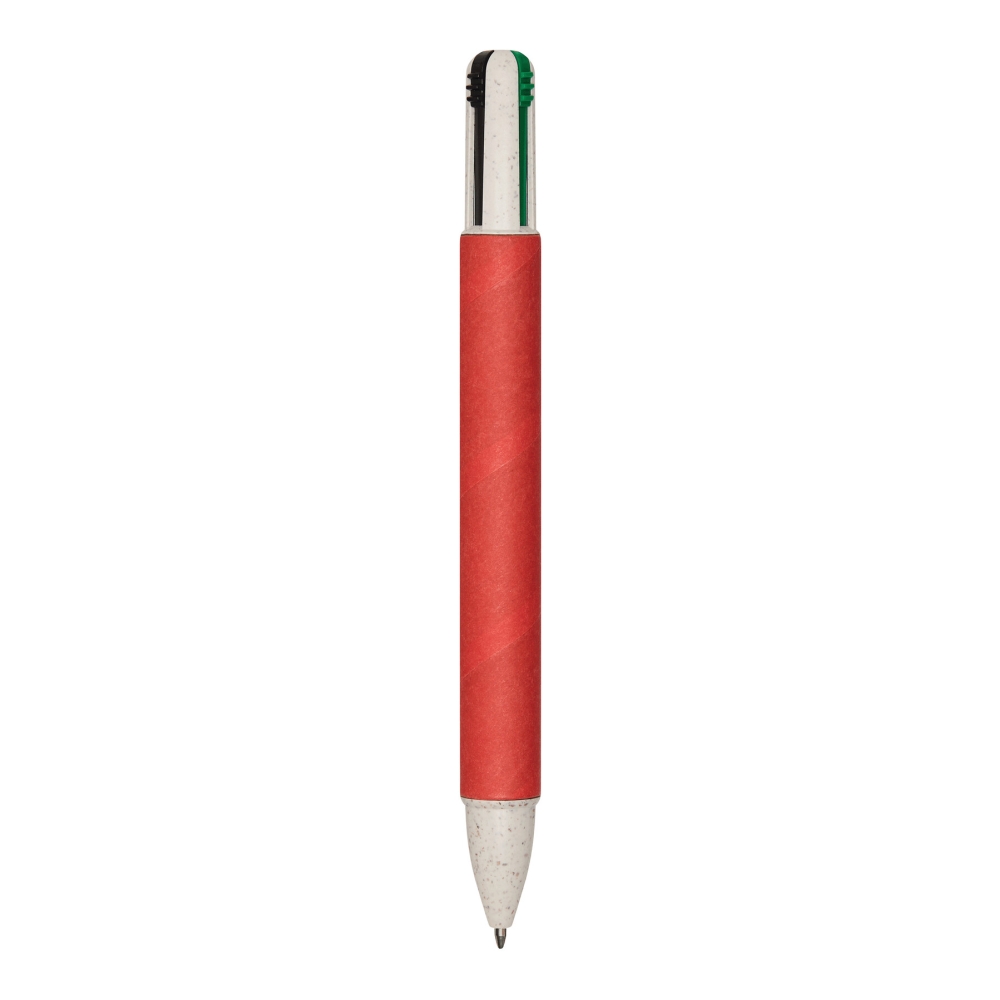 Multi ballpoint pen, four colours: made of wheat straw and ABS, barrel covered in recycled carton, push mechanism, ball pen refills with black, red, blue, and red ink. Dimensions: 14,3 cm