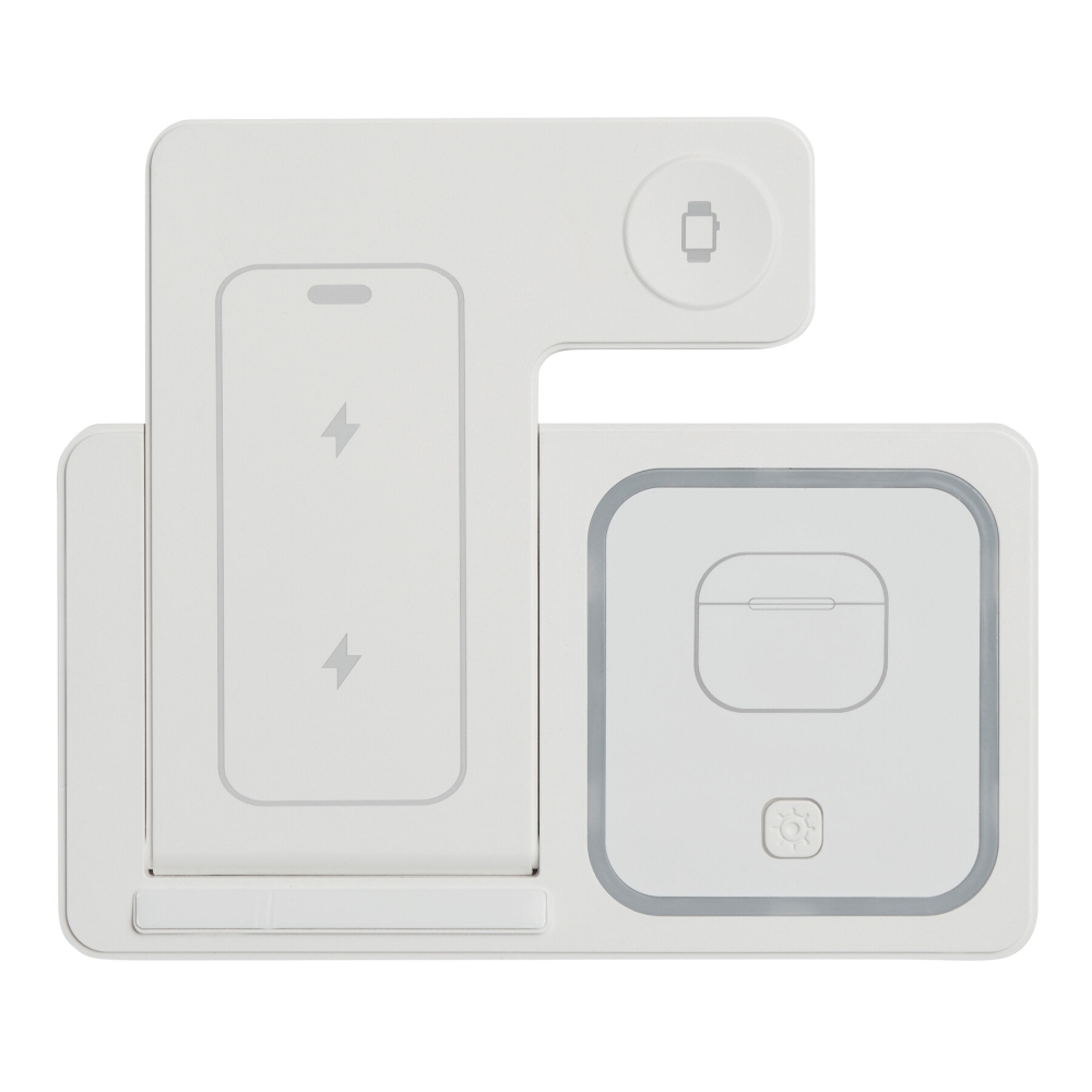 Multi inductive charging station: foldable, wireless charging of up to 3 devices simultaneously (smartphne (horizontally or vertically), wireless in-ear headphones, Apple iWatch®) by placing them on the respective contact surface (device must be equipped for inductive charging), USB cable with USB Type-C plug (length approx. 80 cm), input power: 9V/2A, 12V/1,67A, output power: 5 W, 7,5 W, 10 W, 15 W, 2,5 W (for iWatch® and earphones), indicator light glows blue during the charging process, green when charging is complete, and flashes blue when foreign objects are detected, on/off switch for light, 4 anti-slip feet on the bottom, in box. Dimensions: 16,6 x 14,2 x 1,4 cm