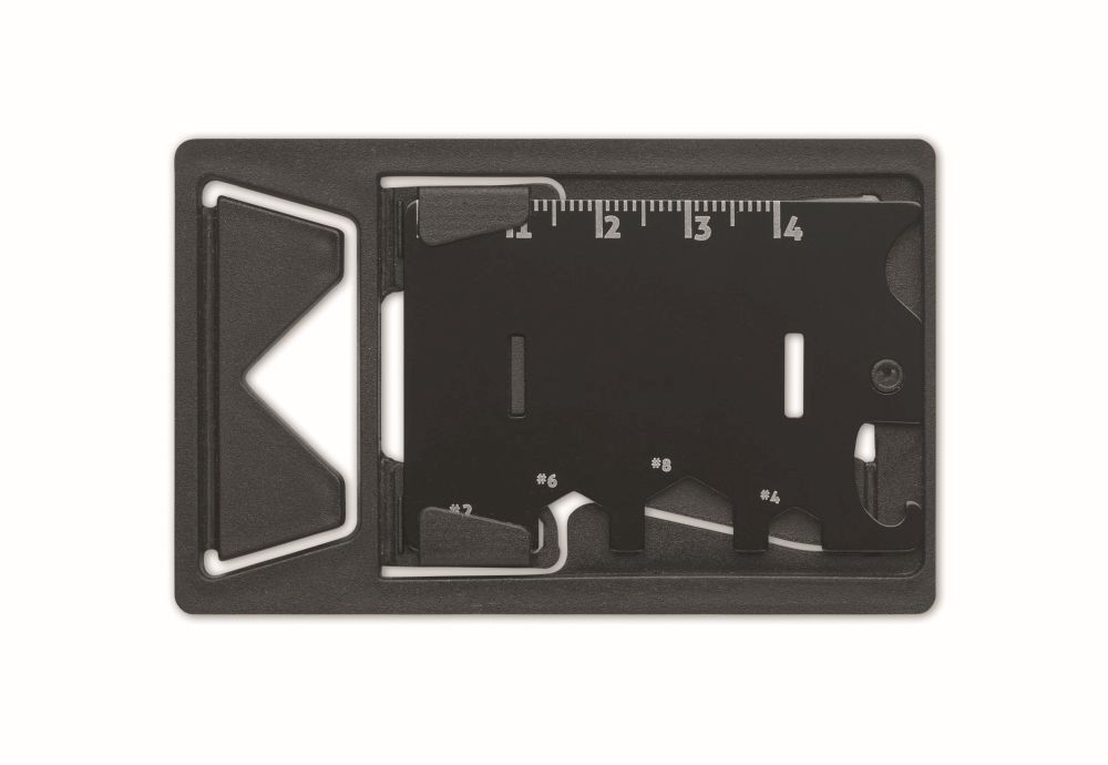 Multi-tool in stainless steel and PP with phone stand functionality with 6 functions in PU pouch. It includes screwdrivers, ruler, hexagonal wrench and bottle opener.