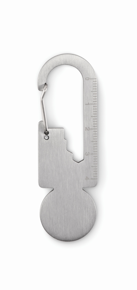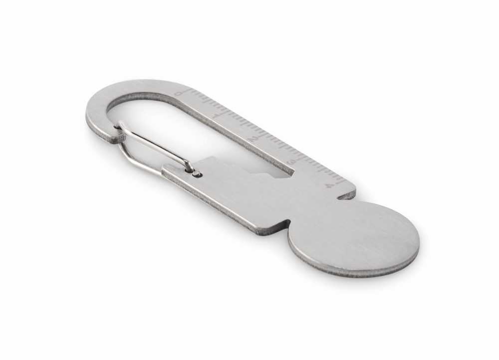 Trolley token with key ring in recycled stainless steel with multi-function tool including bottle opener, ruler and hex driver wrench (M1/M2/M3/M4). Dimensions: 7,5 x 2,9 cm