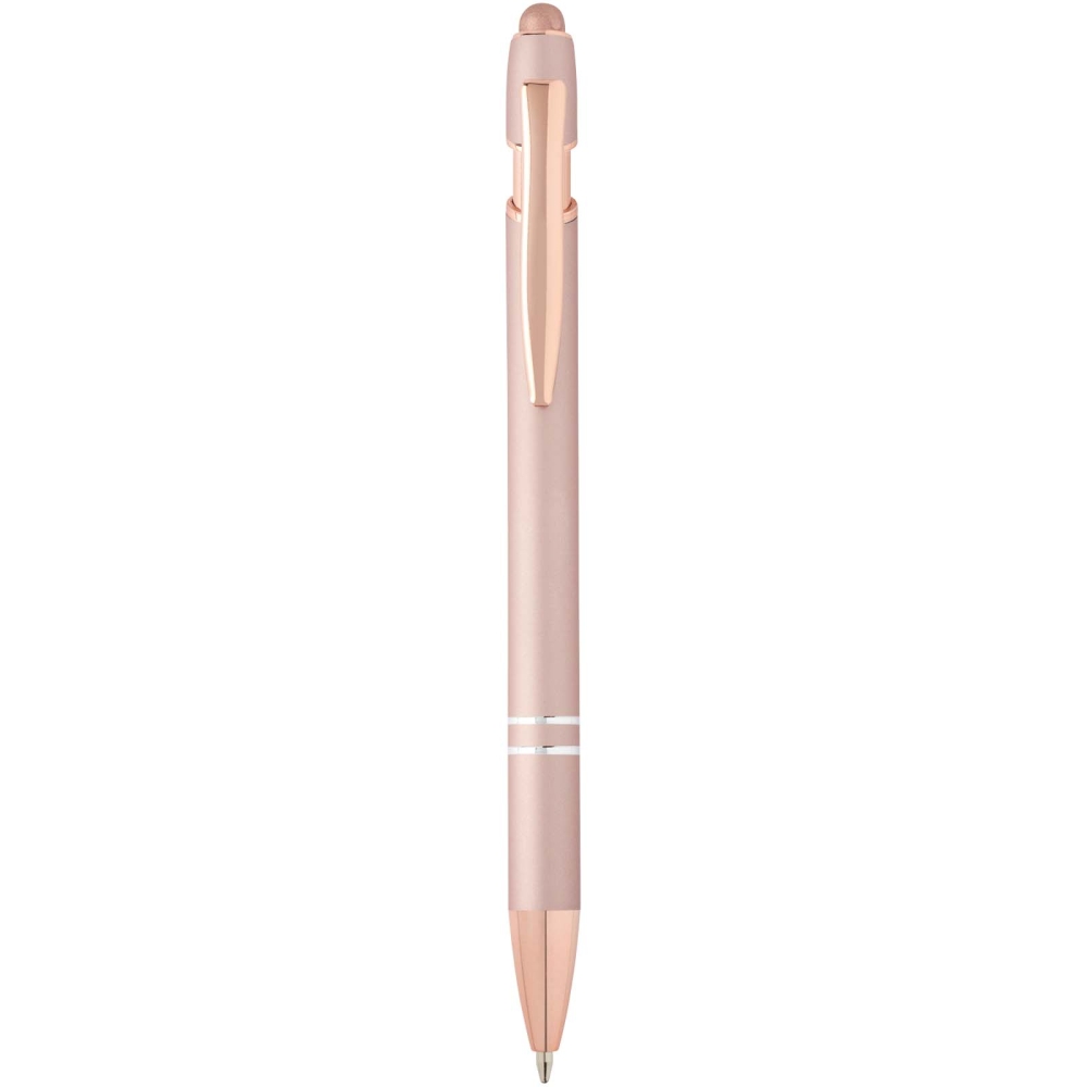 The Nanna ballpoint pen with rose gold finish has a barrel made of recycled aluminium with a touch stylus made of silicone. Recycled aluminium reduces the amount of waste in landfills and helps to conserve natural resources aiming to reduce greenhouse emissions. Ink colour: Black. Writing length: 800 metres. Nib size: 1.0 mm. Dimensions: 14,4 x O 1 cm