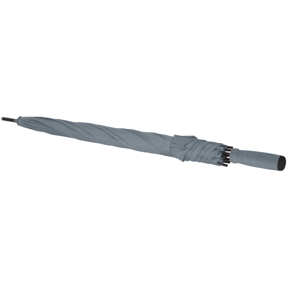 23” automatic opening umbrella with a recycled PET pongee polyester canopy. It has a sturdy metal shaft, fiber glass frame, and a comfortable EVA handle with colour matching end. Large print area on each of the panels.
