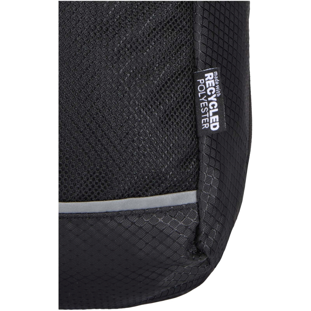 The Nomad hydration crossbody bag is made from GRS certified recycled ripstop fabric with a water-repellent finish, GRS certified RPET lining, and reflective elements. It is designed for fast hikes, trail runs, festivals, or any activity where you need to carry water and essential items without extra bulk. The bag includes a zipped main compartment with an inner sleeve pocket, a mesh front pocket with an elastic drawstring to hold a water bottle securely, and a large quick-access pocket on the back for your phone or other small items. The adjustable strap and breathable mesh back provide carrying comfort. Volume capacity: 6 litres. Dimensions: 21 x 37,5 x 9 cm