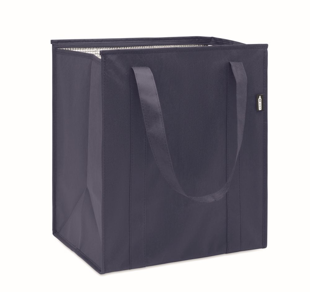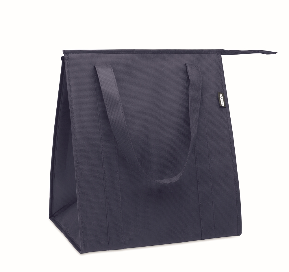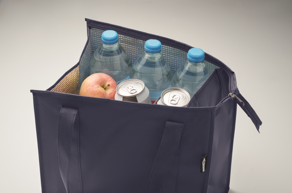 Cooler bag in RPET non-woven 80gr/m2. Isolation material: aluminium foil. Capacity 25L. Main compartment with zipper on top. Dimensions: 33 x 25,5 x 37 cm