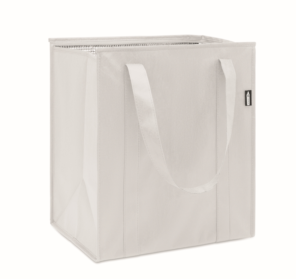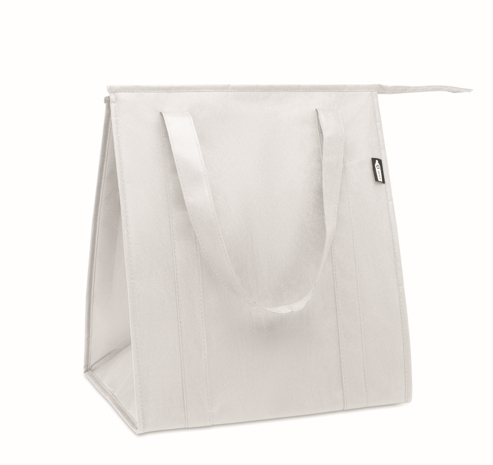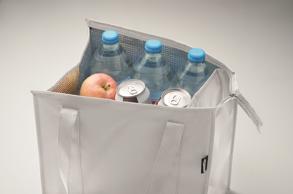 Cooler bag in RPET non-woven 80gr/m2. Isolation material: aluminium foil. Capacity 25L. Main compartment with zipper on top. Dimensions: 33 x 25,5 x 37 cm