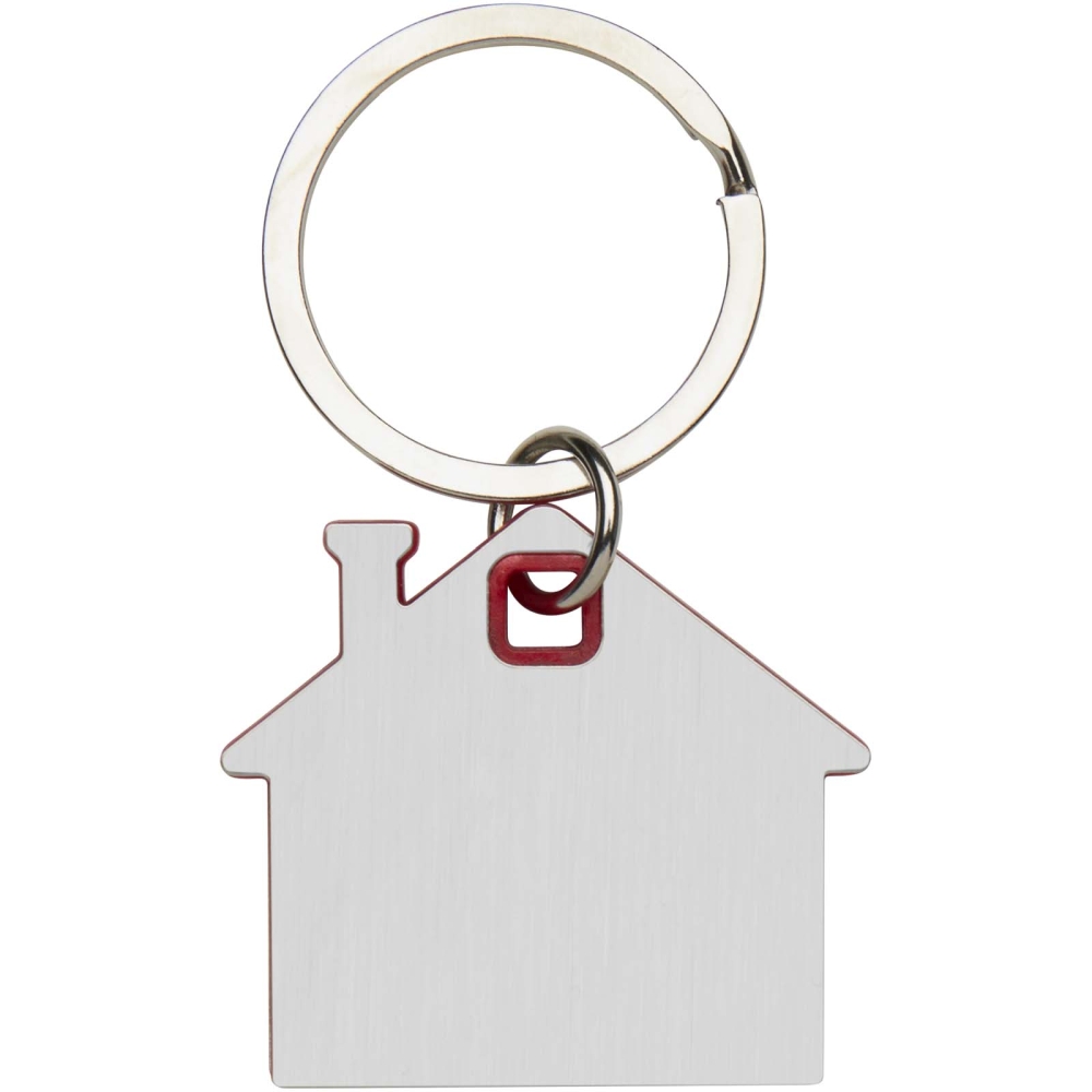 House-shaped keychain with a stainless steel plate with a frosted design front and back, and a coloured plastic chip in the middle. Dimensions: 4 x 0,3 x 6 cm