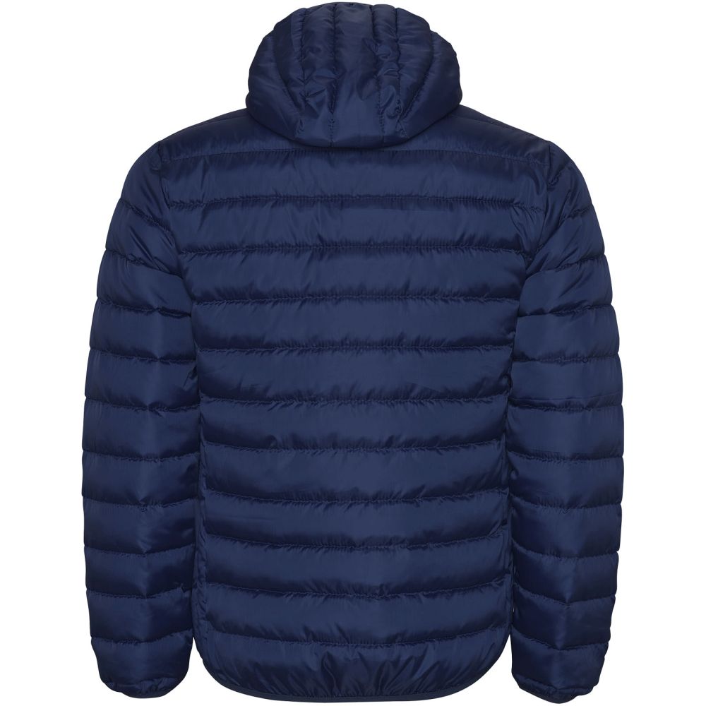 Mens feather touch quilted jacket with fitted hood. Inverted zips with matching chin protector. Two front pockets with zip. Matching elastic trim in cuffs, hem and hood. Contrasting inner lining. Stow carry bag included. Light and foldable garment. Water resistant. Wind-proof model.