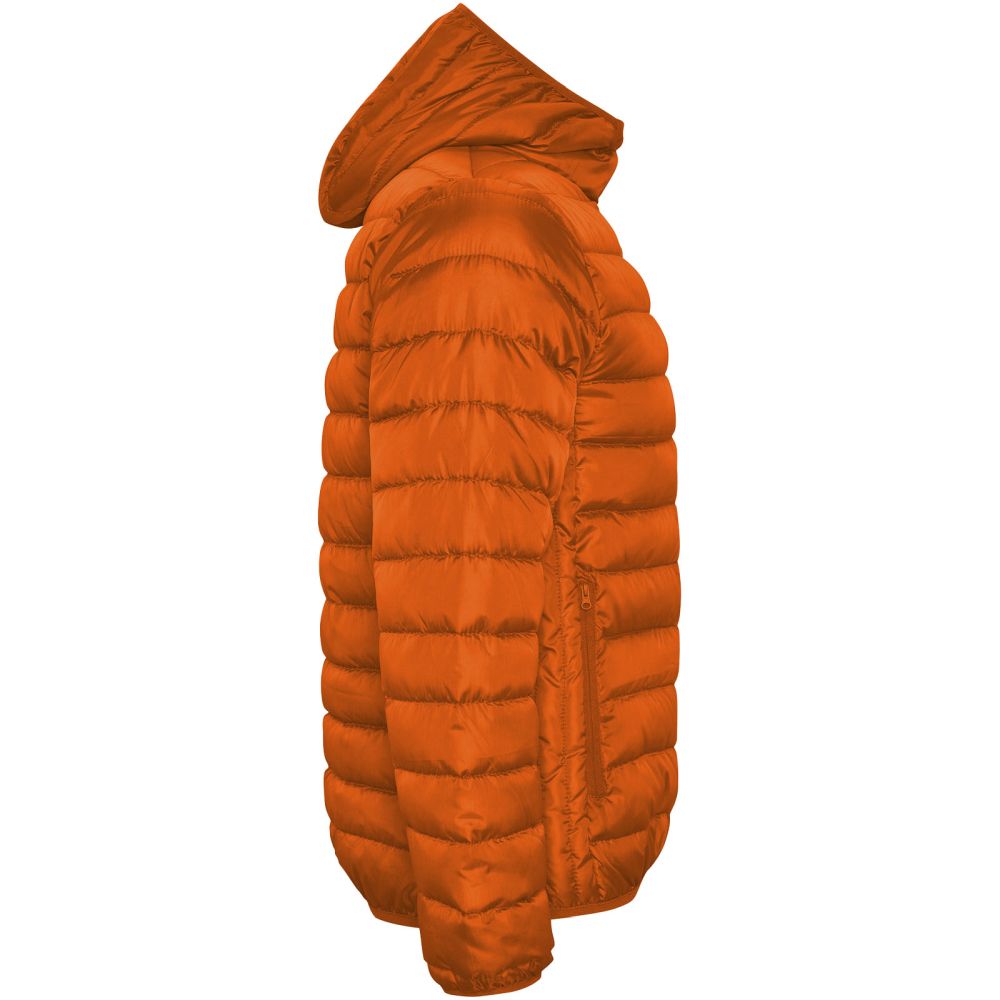 Mens feather touch quilted jacket with fitted hood. Inverted zips with matching chin protector. Two front pockets with zip. Matching elastic trim in cuffs, hem and hood. Contrasting inner lining. Stow carry bag included. Light and foldable garment. Water resistant. Wind-proof model.