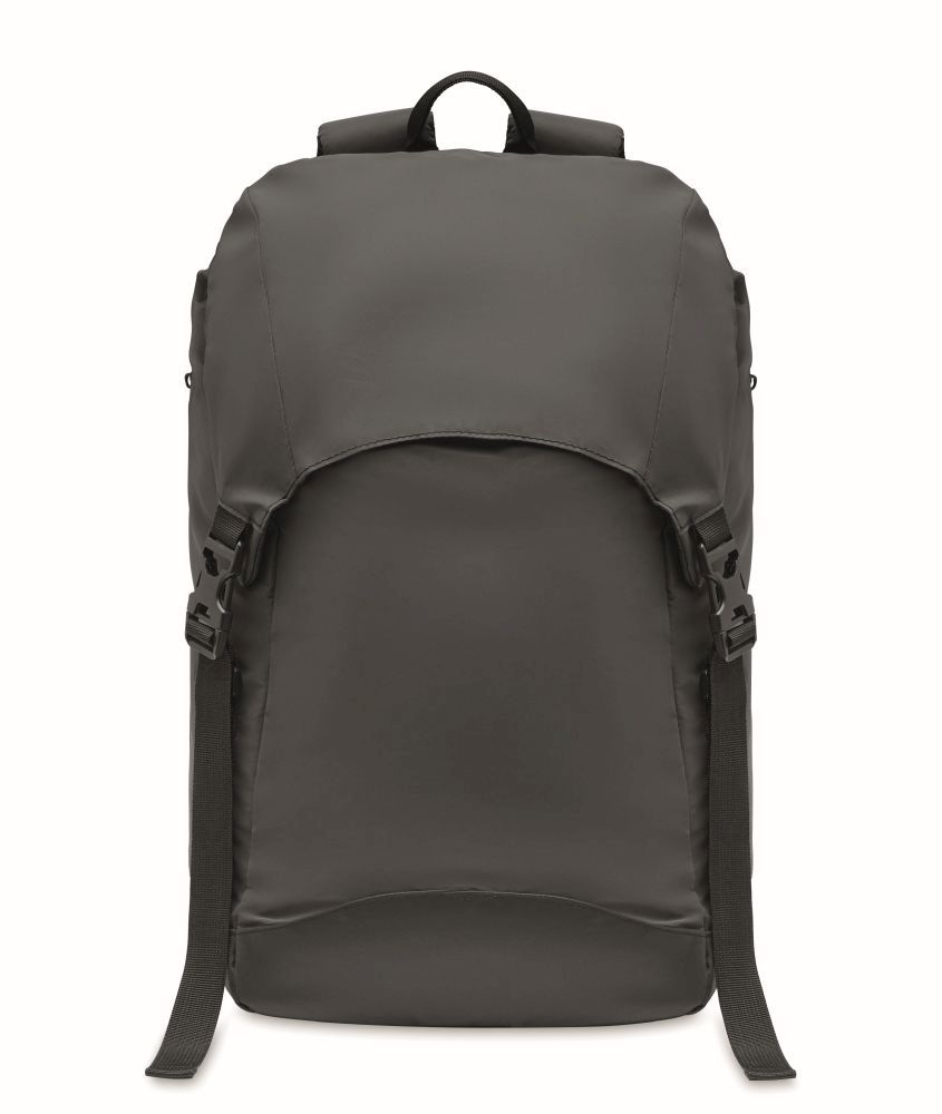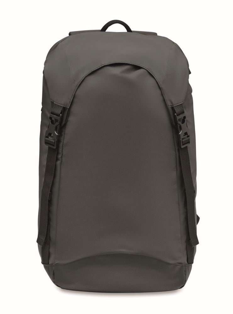 Outdoor backpack in 190T polyester coated with reflective granules. Side zippered outer pocket and padded back, inner lining with drawcord closure. One large padded inner laptop compartment. It has adjustable padded shoulder straps and adjustable chest and waist strap with buckle closure. Water repellent.