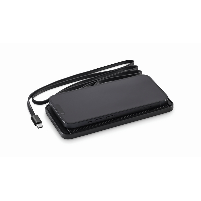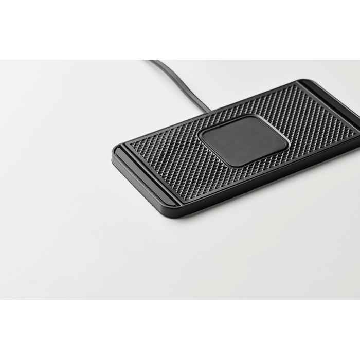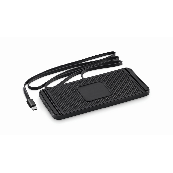 Car wireless charger 15W, anti slip pad in PVC. Adjustable as the edges can be cut to fit the required size. Integrated USB A cable, length 120 cmDimensions: 15 x 7 x 0,5cm