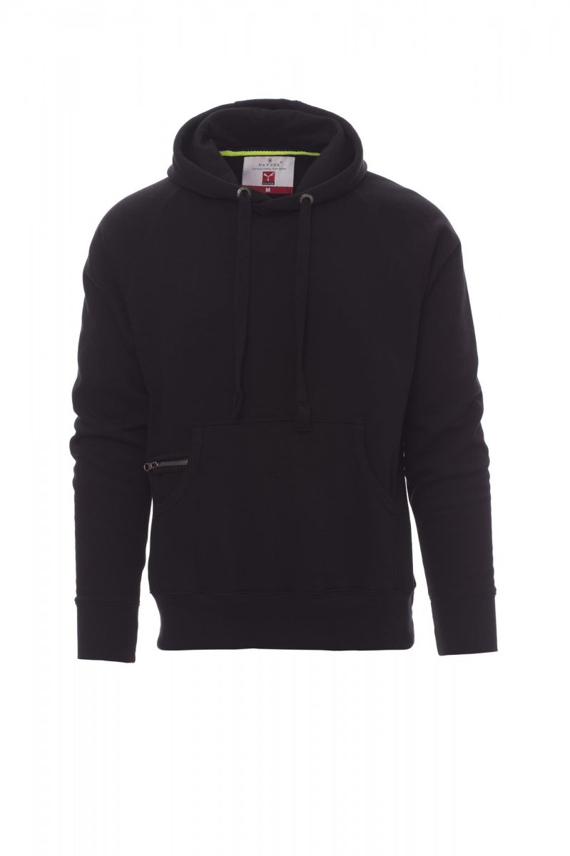 Men’s hoodie with double stitched seams and white drawstring with contrasting stitching and metal rings, raglan sleeves, V-design neck stitching, kangaroo pockets, small zip pocket, stretch rib cuffs and hem, reinforced seams, 300gr/m2. Material 70% bavlna, 30% polyester.
