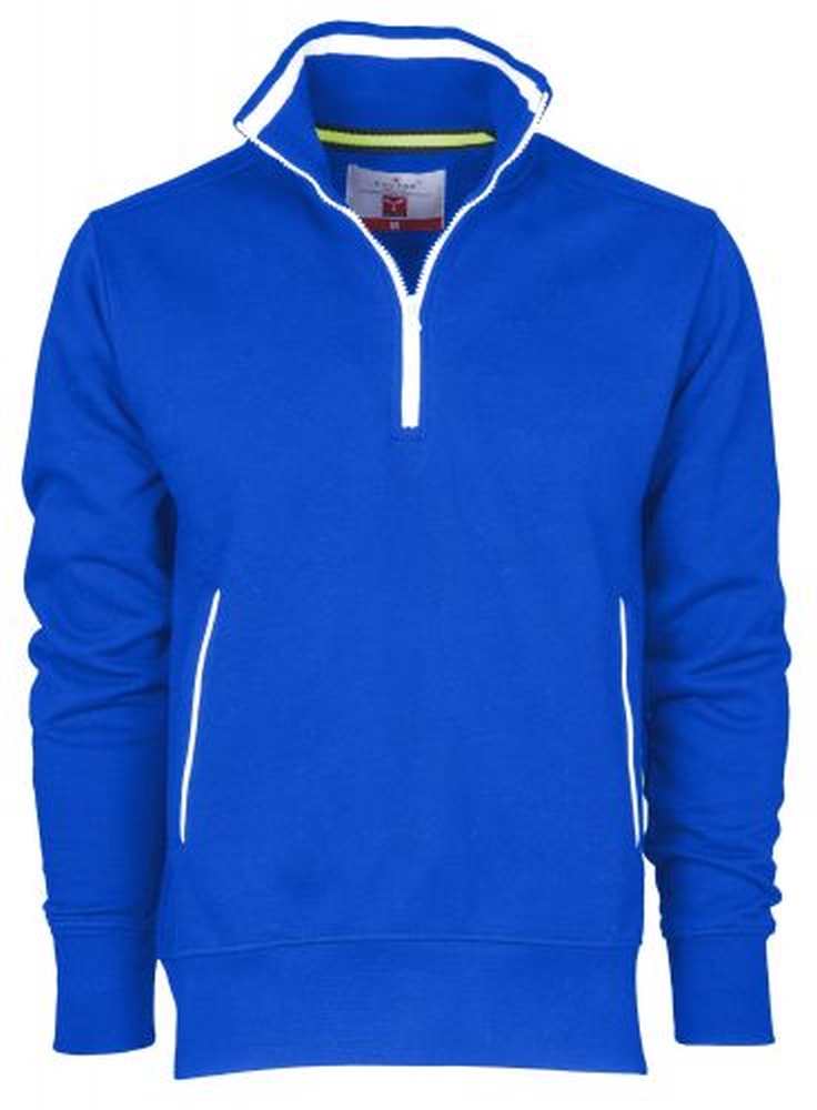 Men’s sweatshirt with half zip in contrasting coloured plastic with metal pull, contrasting trim on the collar and side pockets. Fitted sleeves, stretch rib cuffs and hem, reinforced seams. Material: 70% cotton + 30% polyester.