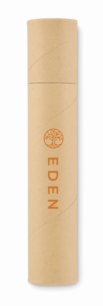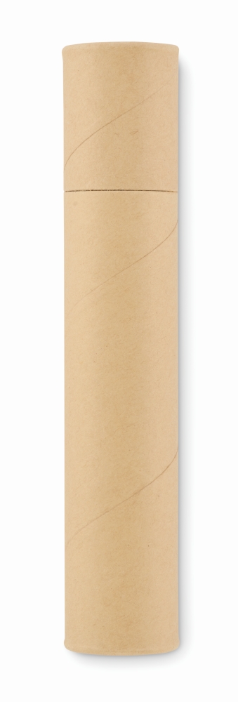Paper tube box including 2 pencils, 1 carton barrel pen, 1 wooden sharpener and 1 eraser. Dimensions: O 3,6 x 19.5 cm