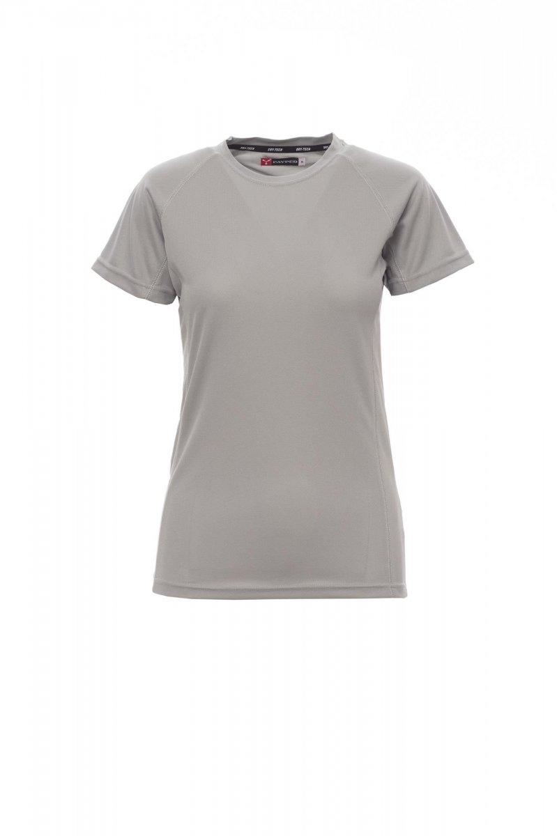 Women technical sporting T-shirt skinny with short and raglan sleeves, double side seam for better portability, contrast neck band. 100% polyester, 150 gsm. Sizes: S-M-L-XL.
