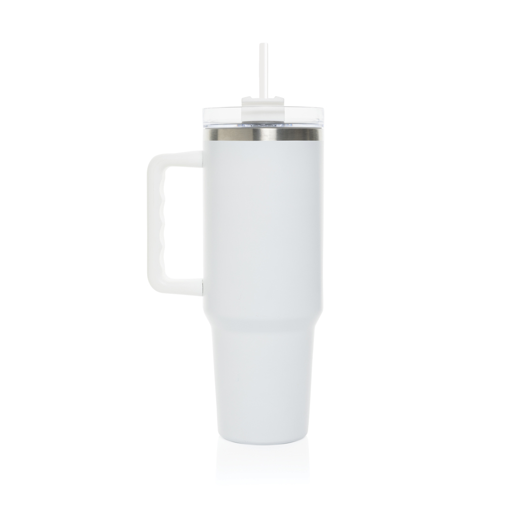 Meet Peakflow, the ultimate 1200 ml tumbler designed for those who need a little extra. Its comfort-grip handle and slim base make it easy to carry and fit into most cup holders, keeping you hydrated on the go. Outside made from durable recycled stainless steel, Peakflow’s double-walled, vacuum-insulated body keeps drinks at the perfect temperature. It features a spill-proof lid with a dual function for sipping or using the included recycled steel straw with a silicone tip. RCS-certified, with 29% recycled content, and BPA-free. Perfectly practical and lower impact, we recommend handwashing.Bulk packed.