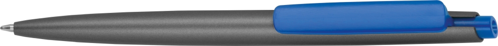 Retractable biros made of recycled plastic with coloured applications and large capacity refill that writes in blue. Your logo is printed to the right of the clip. Dimensions: o 1 x 14,3 cm