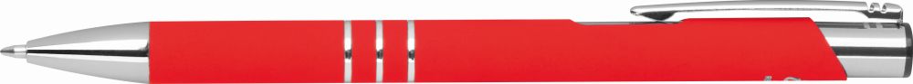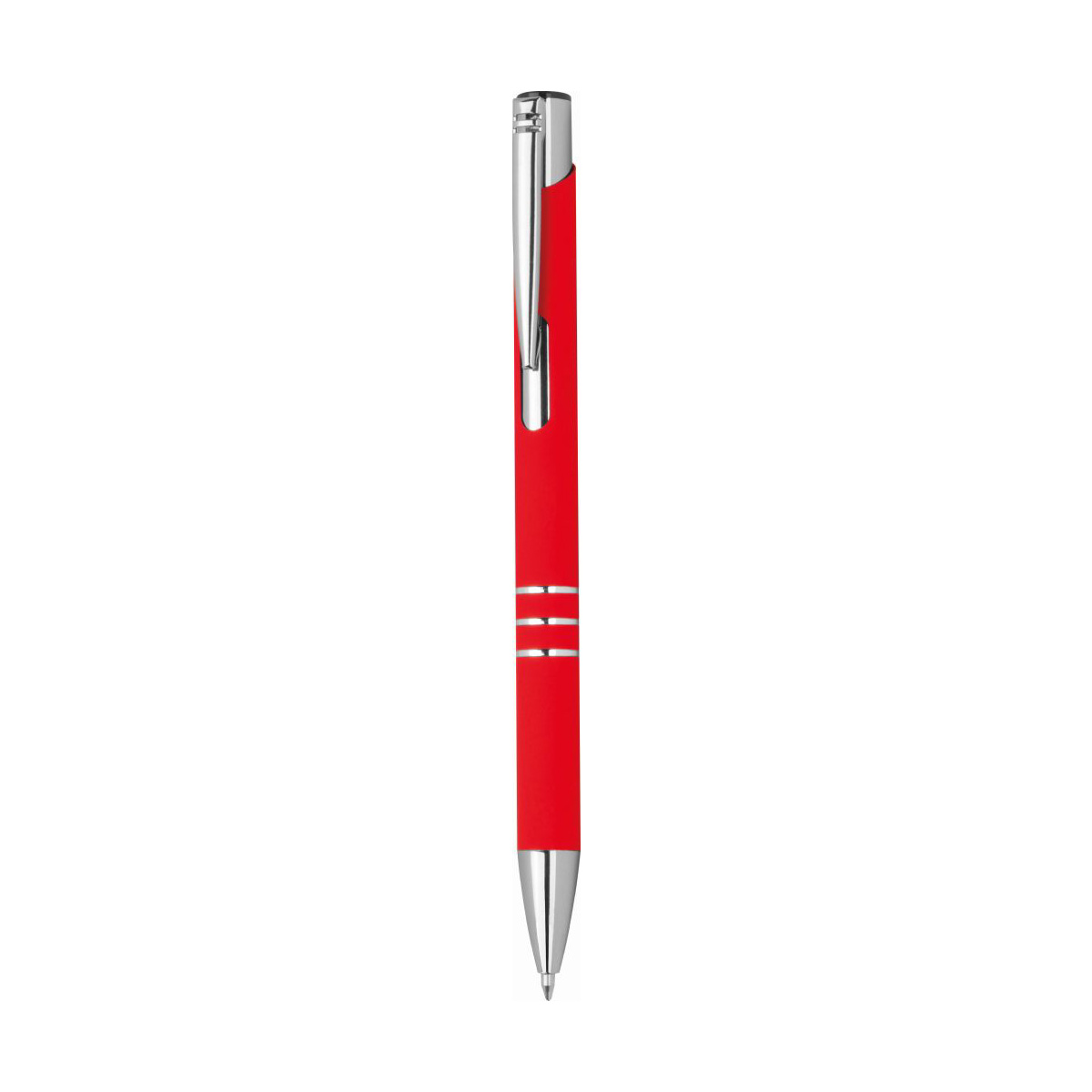 Recycled aluminium pen with rubberised surface and blue gel refill. We engrave your logo next to the clip.