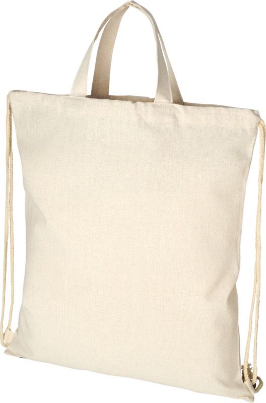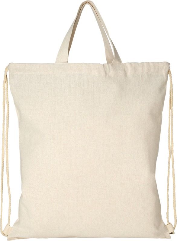 Pheebs 210 g/m2 recycled cotton drawstring backpack. Recycled cotton is manufactured from pre-consumer waste generated by textile factories during the cutting process. Large main compartment with cotton drawstring closure. Designed for shoulder or backpack carry. Features two handles with a dropdown height of 31 cm. Resistance up to 5 kg weight. 210 g/m2 Recycled cotton.