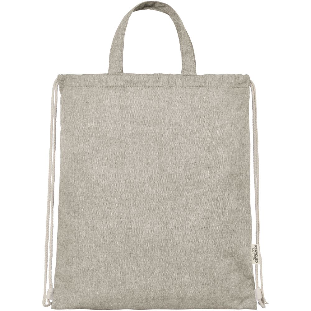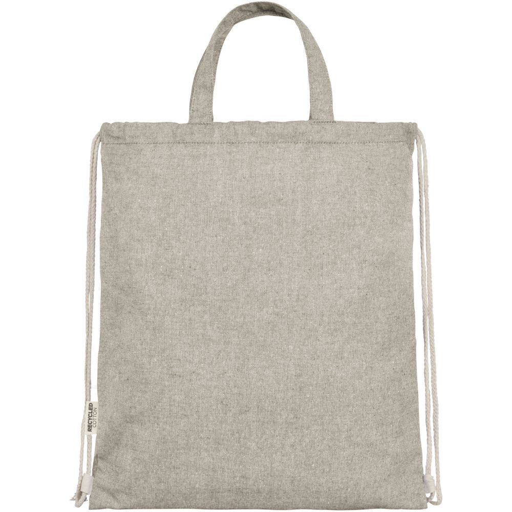 Drawstring backpack made of a 150 g/m2 recycled cotton polyester blend. Large main compartment with cotton drawstring closure in natural colour. Recycled cotton is manufactured from pre-consumer waste generated by textile factories during the cutting process. Similar colours are blended together so no additional dyeing is required. Due to the nature of recycled cotton, there may be a very slight colour variation. This distinctly adds to a more authentic appearance. Each backpack also comes with an Aware™ tracer. This innovative feature allows users to trace the origins and journey of their item through a QR code, enhancing transparency in the supply chain and fostering a stronger connection between the product and its production process. Resistance up to 5 kg weight. Handle length: 14 cm.