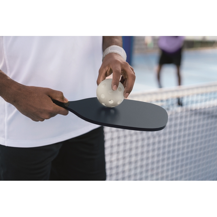 Pickle ball paddle set with 2 MDF wooden bats and 1 ball in RPET mesh drawcord pouch.Dimensions: 40 x 19,2cm