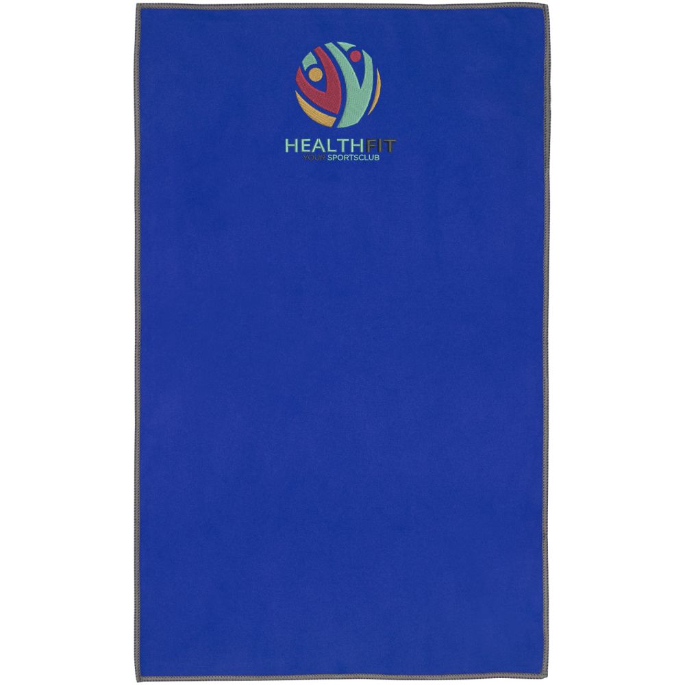 The Pieter sport towel absorbs very well, is lightweight, dries quickly, and the fabric is durable and extremely soft. When the towel is folded and secured with the elastic band its reduced to a small size, making it suitable for bringing to the gym, swimming pool, or for when going backpacking or camping. The towel has a size of 50 x 30 cm and is made from 90% GRS recycled polyester and 10% nylon, and can be washed in the washing machine at 40 °C. Delivered with a storage pouch (15.5 x 10 cm) made from recycled PET plastic, which provides a great area for printing a logo.