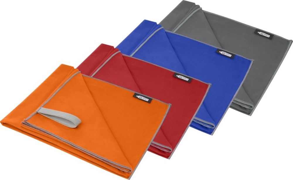 This sport towel absorbs very well, is lightweight and dries quickly. In addition, the fabric is durable and extremely soft. When the towel is folded and secured with the elastic band its reduced to a small size, making it suitable for bringing to the gym, swimming pool, or for when going backpacking or camping. The towel has a size of 130 x 80 cm and is made from 200 gr/m2 recycled PET polyamide, and can be washed in the washing machine at 40 °C. Delivered with a storage pouch (20 x 8.5 cm) made from recycled PET plastic, which provides a great area for printing a logo.