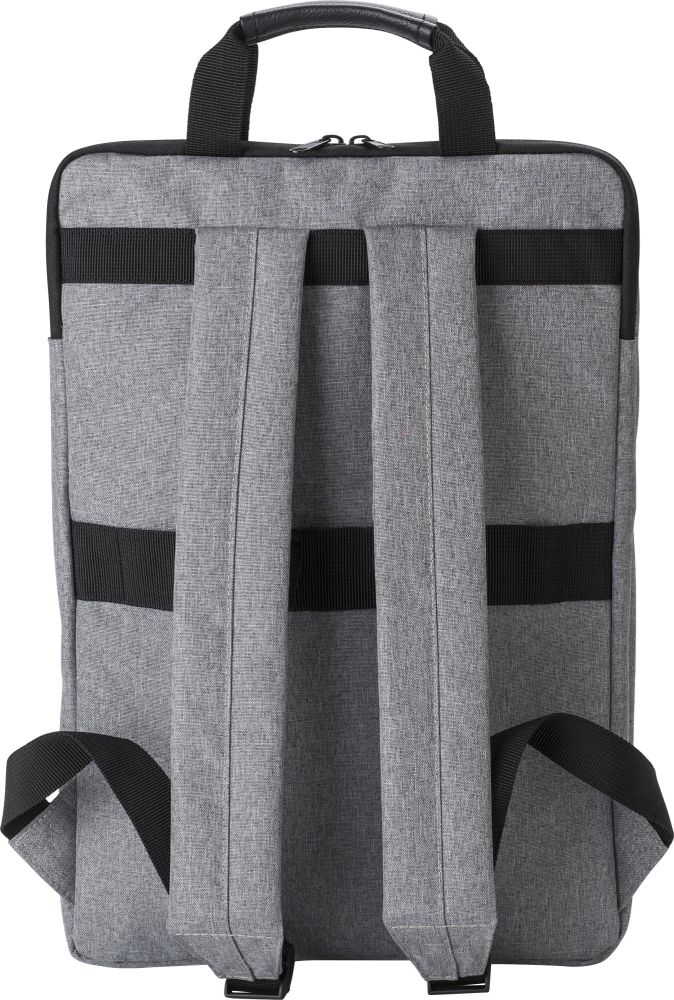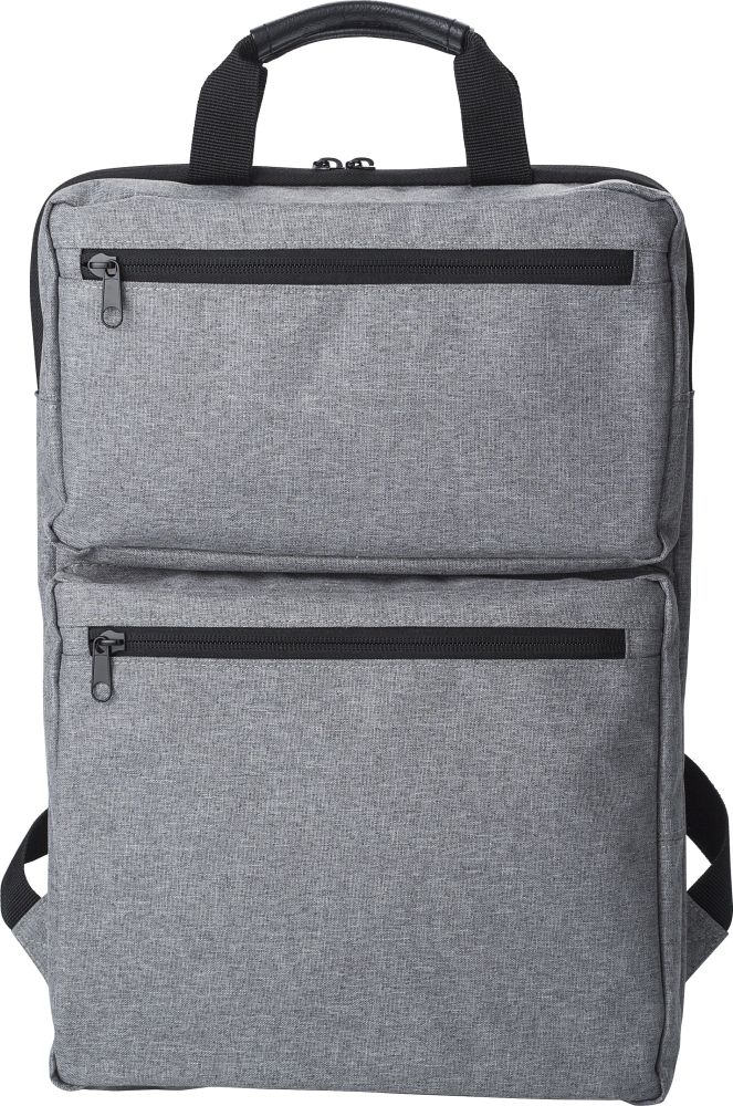 Polycanvas (300D) backpack with two outside pockets with zipper, and laptop compartment inside (15 inch). With padded shoulder straps and two short handles on top.