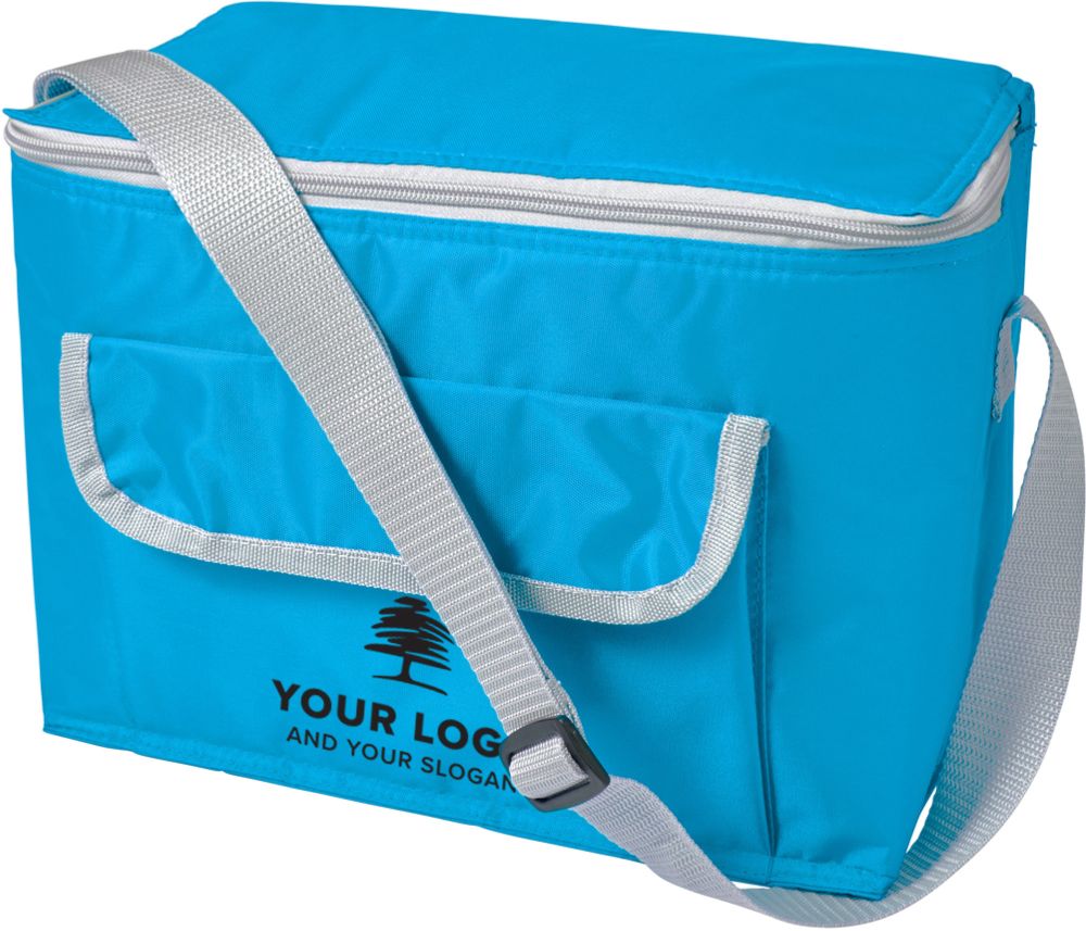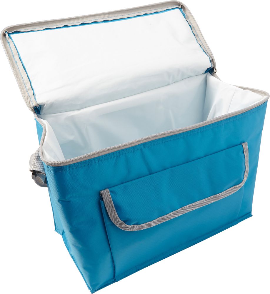 Polyester (420D) rectangular cooler bag with extra front pocket with flap.
