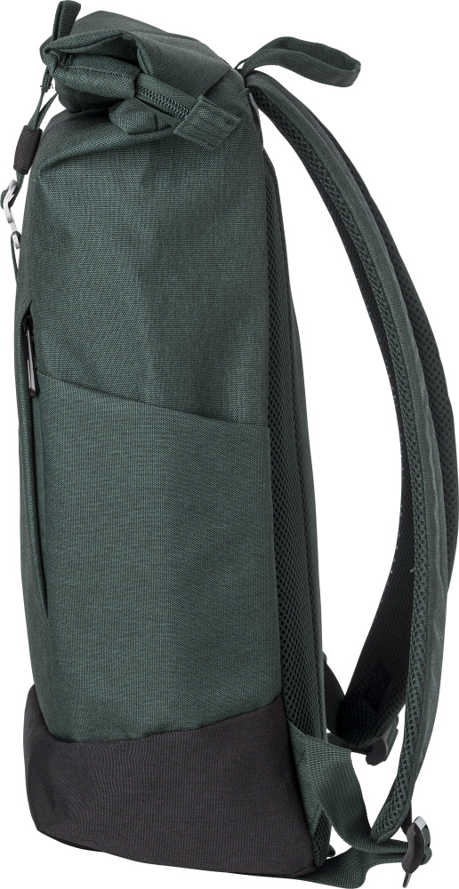 Polyester (600D) rolltop backpack. One large zippered compartment with two slip pockets and a laptop compartment. Zippered compartment in the front. Padded backside and straps. Metal hook for closure. Dimensions: 25 x 14 x 45 cm