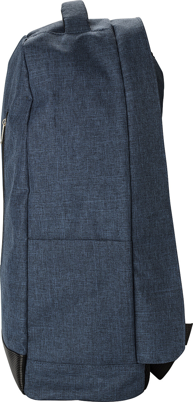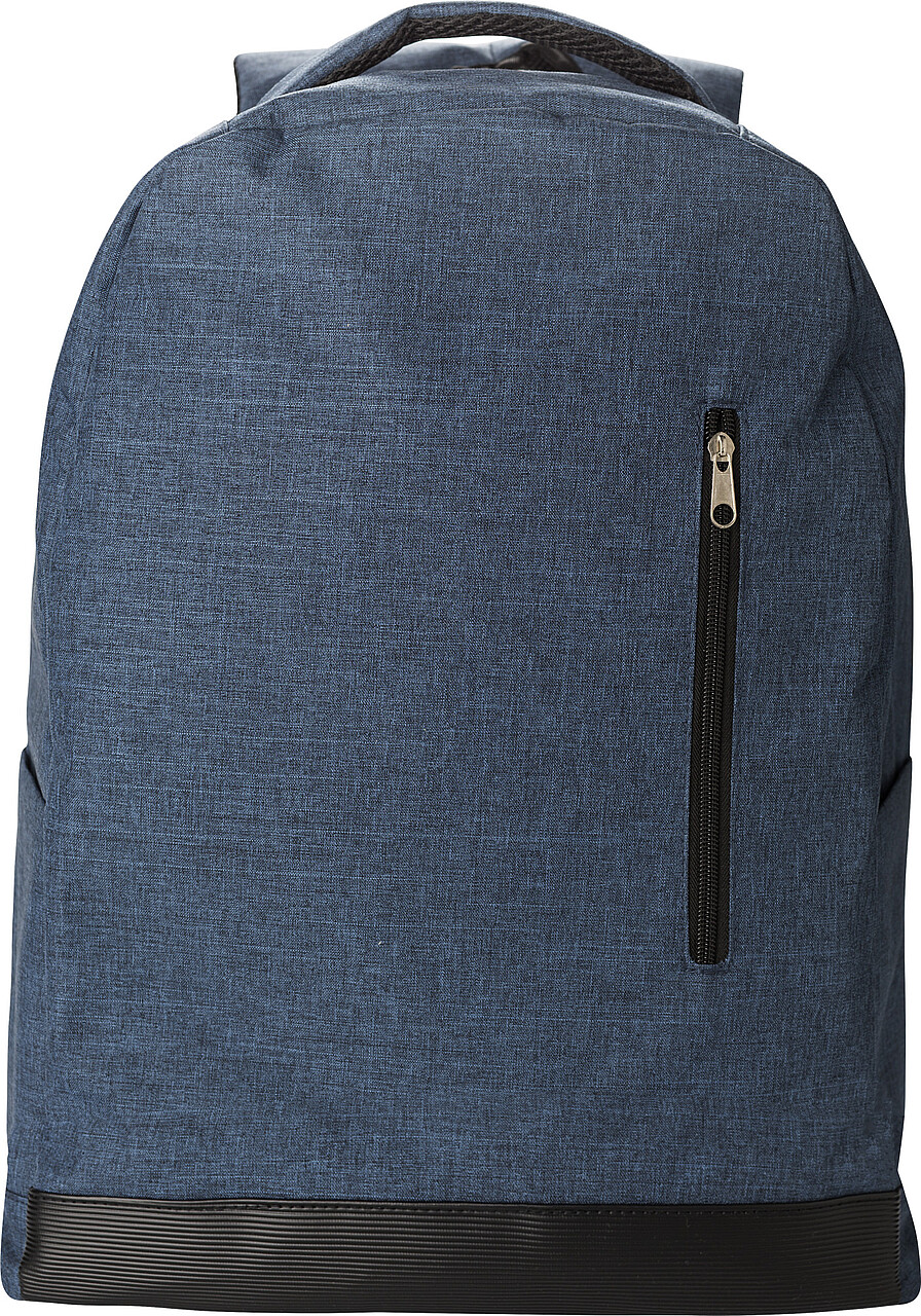 Polyester RPET (600D) backpack (15 inch) with anti-theft function. Small pocket on back and front side, compartments for bottles on the side, trolly strap, laptop compartment with Velcro closing, and adjustable straps. The details on the bottom is made from recycled car tires.