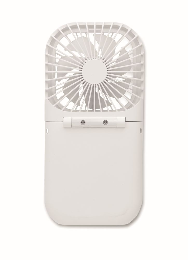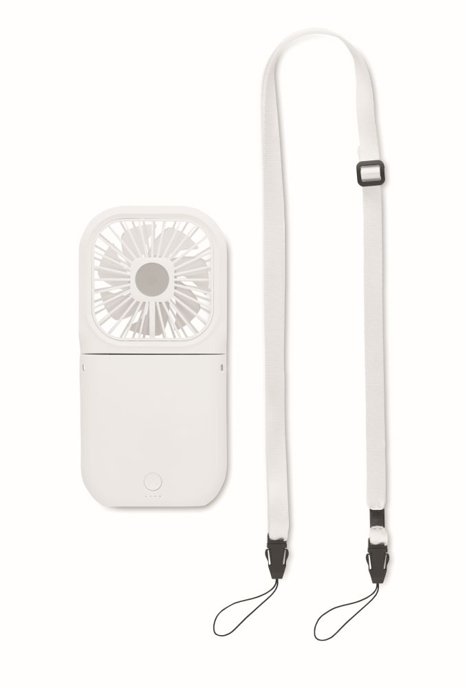 Portable foldable fan with adjustable neck strap. 4 speed settings. Can also be used as desk fan when folded. Including a 3000 mAh power bank. In/Output: Type-C & output type A.