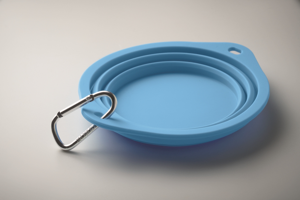 Collapsible portable silicone single drinking or food pet bowl with carabiner. Capacity: 350ml. Dimensions: 15,3 x 1,5 cm