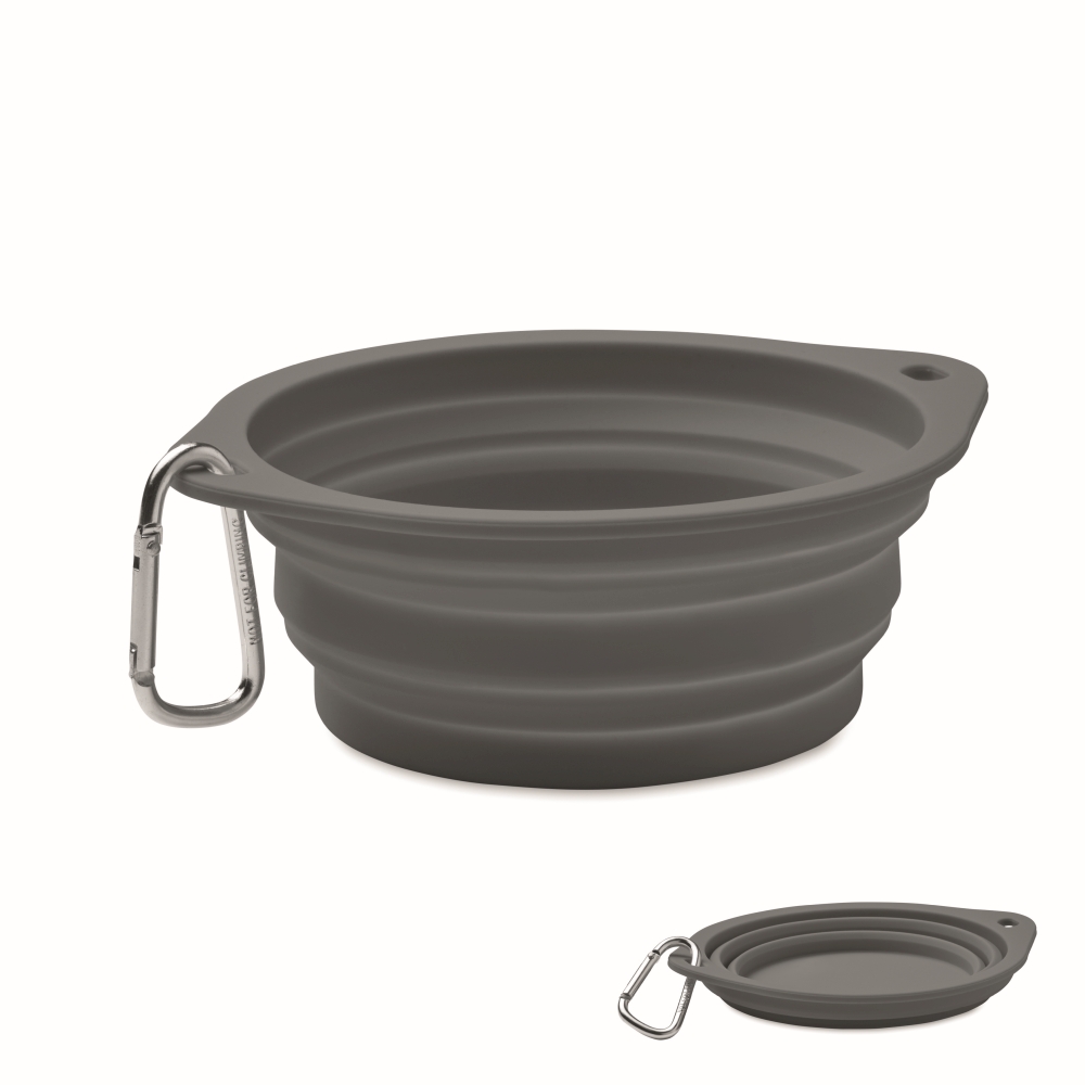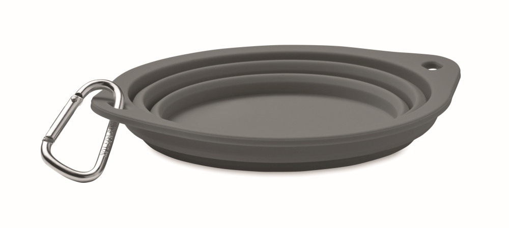 Collapsible portable silicone single drinking or food pet bowl with carabiner. Capacity: 350ml. Dimensions: 15,3 x 1,5 cm