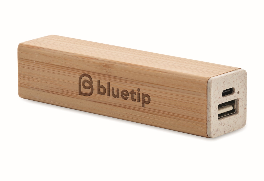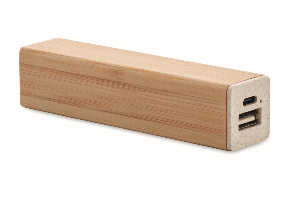 Power bank 2600 mAh in bamboo case. Capacity for smartphone, output current DC5V/2A. Including USB Type-C charging cable with Type-A adaptor. In/Output: USB Type-C. Dimensions: 10,2 x 2,5 x 2,5 cm