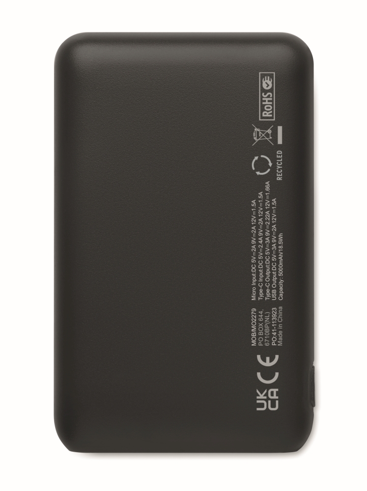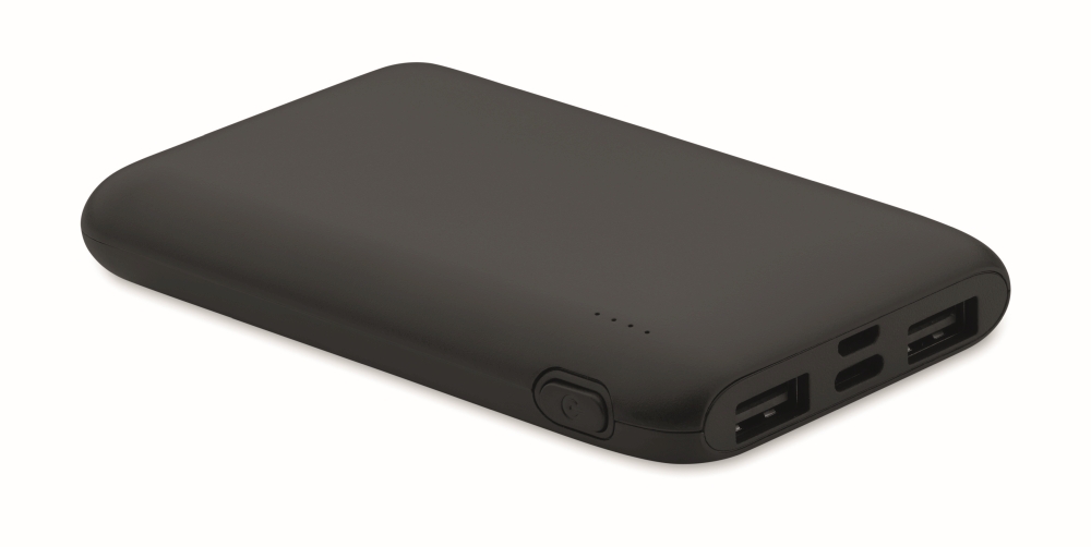 Power bank 5000 mAh in recycled ABS. Capacity for smartphone use, Output: 1 x Type-C, 2 x Type-A & 1 x Type-B. Input: 2-in-1 Type C & Type-A. Dimensions: 9,9 x 6,2 x 1,5 cm
