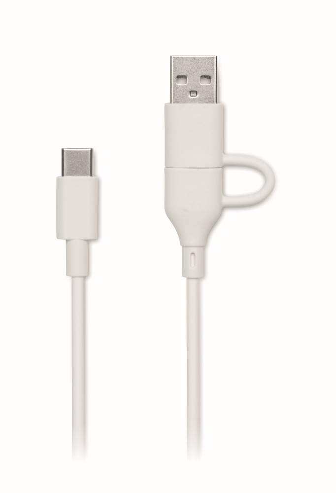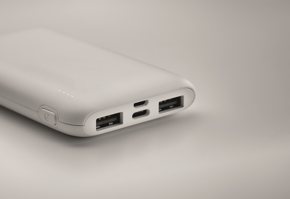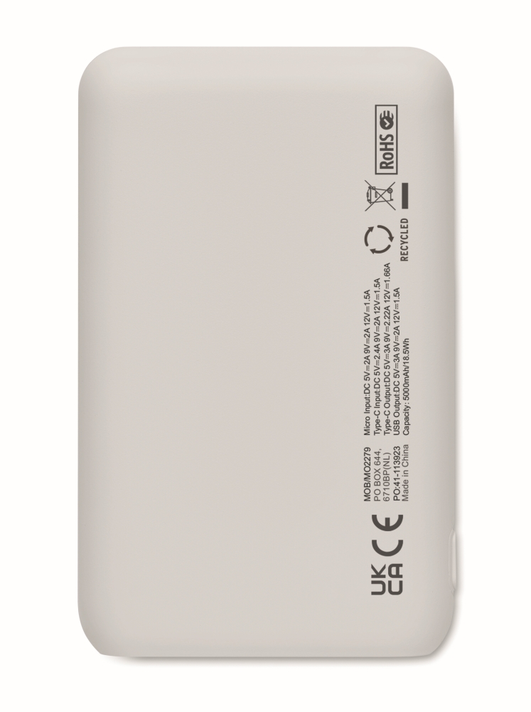 Power bank 5000 mAh in recycled ABS. Capacity for smartphone use, Output: 1 x Type-C, 2 x Type-A & 1 x Type-B. Input: 2-in-1 Type C & Type-A. Dimensions: 9,9 x 6,2 x 1,5 cm