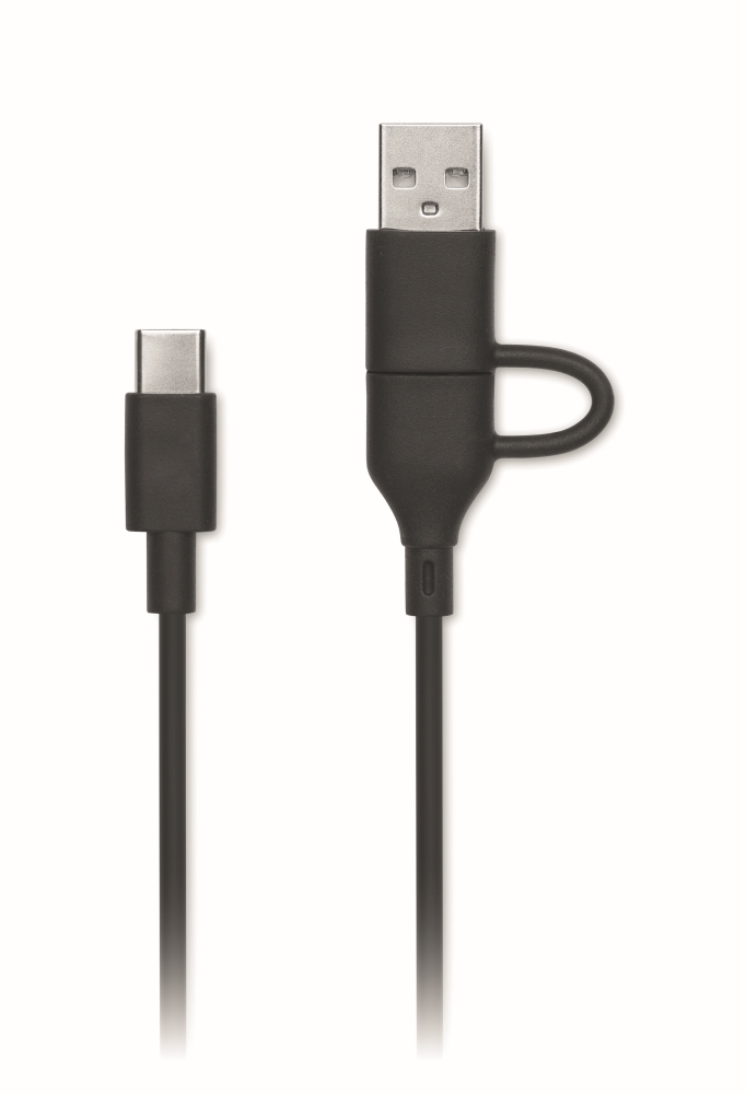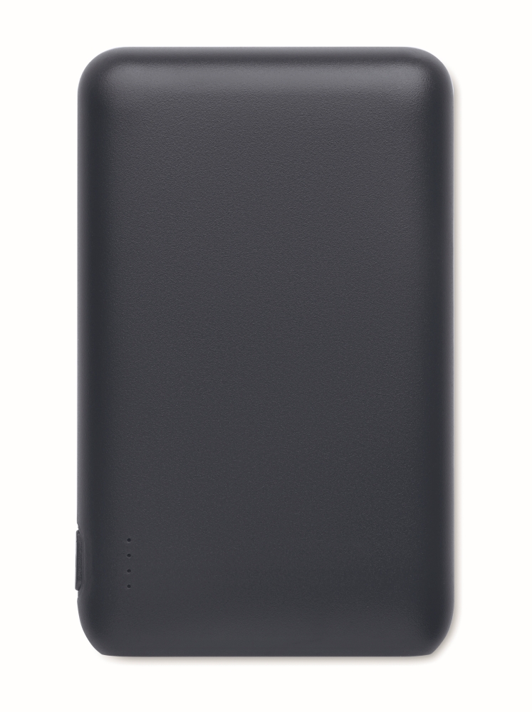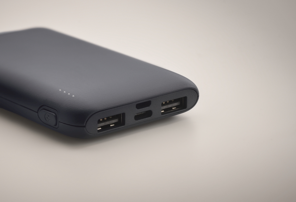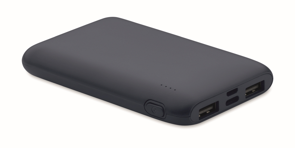Power bank 5000 mAh in recycled ABS. Capacity for smartphone use, Output: 1 x Type-C, 2 x Type-A & 1 x Type-B. Input: 2-in-1 Type C & Type-A. Dimensions: 9,9 x 6,2 x 1,5 cm