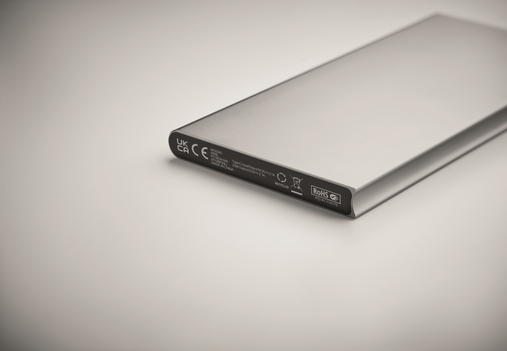 Power bank 8000 mAh in recycled aluminium. Capacity for smartphone use, output current DC5V/2A. Including USB Type-C charging cable. In/Output: USB Type-C. Dimensions: 7,5 x 15,2 x 0,9 cm