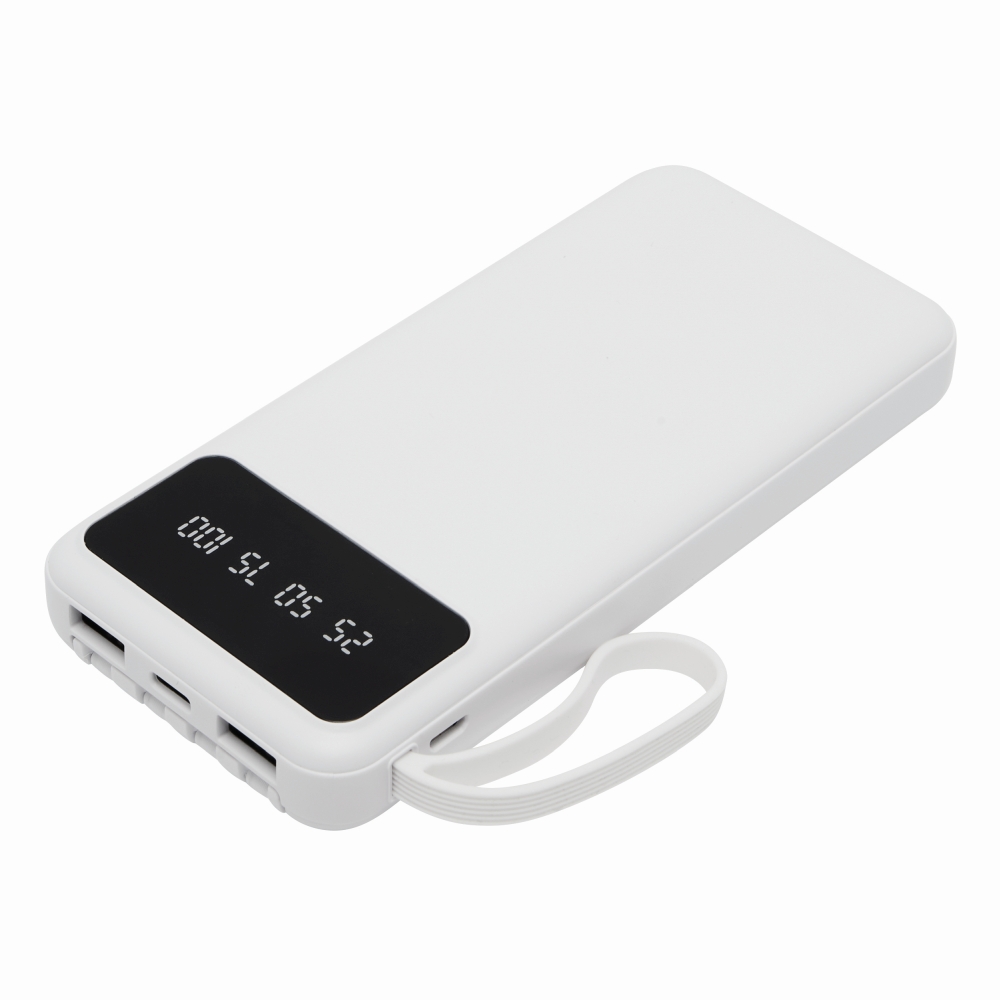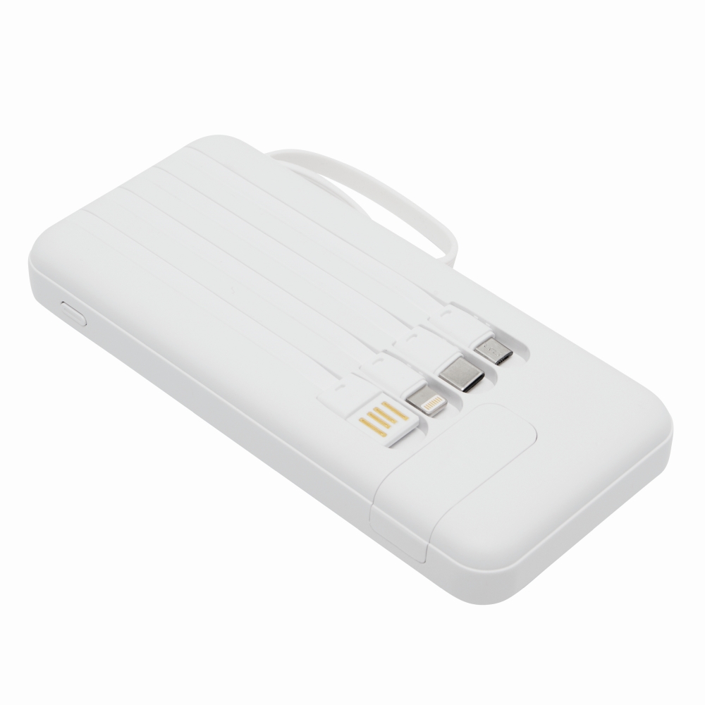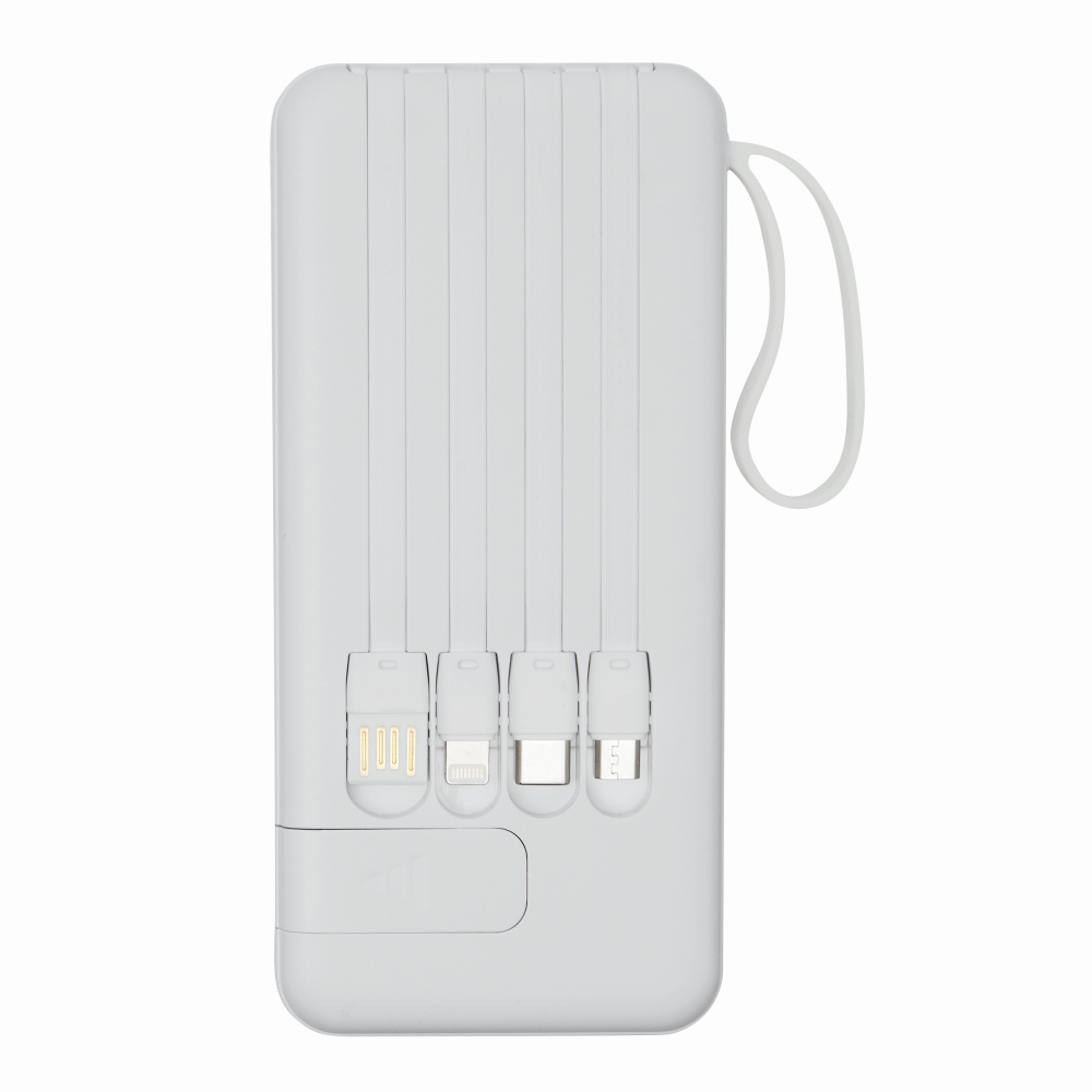 bPowerbank MULTI CHARGE/b: suitable for smartphones and USB-connected devices, 1 USB Type-C and 2 Type-A outputs, capacity: 10.000 mAh, 4 integrated charging cables on the back (Type-C, Micro-USB, Lightning and USB Type-A), charge level indicator (25 / 50 / 75 / 100 %), powerful battery, input power: 5V/2A, output power: 5V/2A (max.), with pull-out smartphone holder, with on/off switch. Dimensions: 14,7 x 6,8 x 1,9 cm
