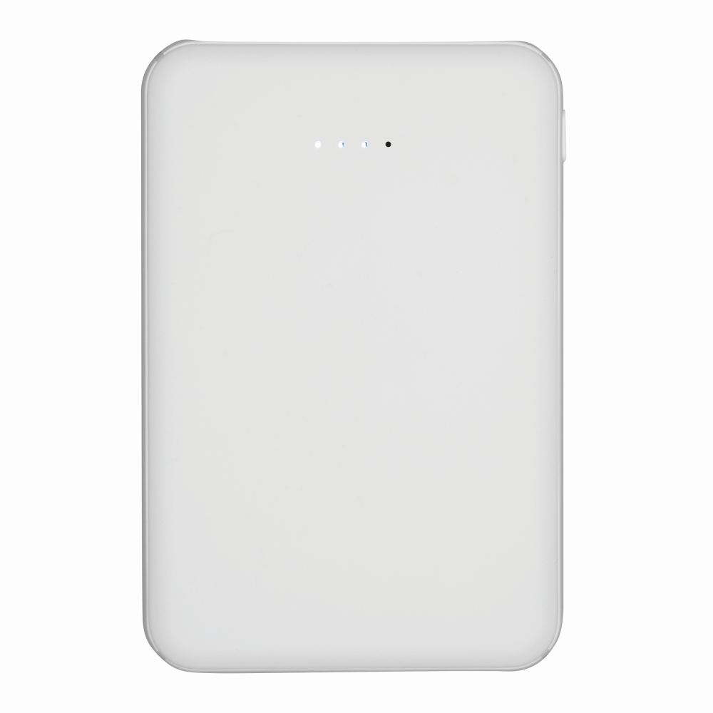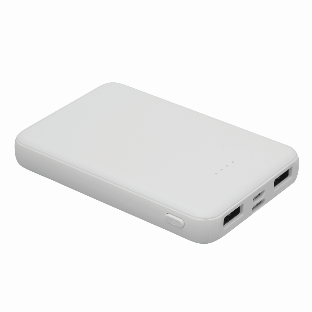 Power bank suitable for smartphones and devices powered via USB, two USB Type-A ports (output), one USB Type-C port (output and input) and one Micro-USB port (input), capacity: 5,000 mAh, incl. USB cable with USB Type-C plug (length: approx. 30 cm), LED charge level indicator, power switch, powerful lithium-ion battery, double-layer protection circuit, input power: 5V/2A, output power: 5V/2A, operation indicator. Dimensions: 9.6 x 6.4 x 1.5 cm