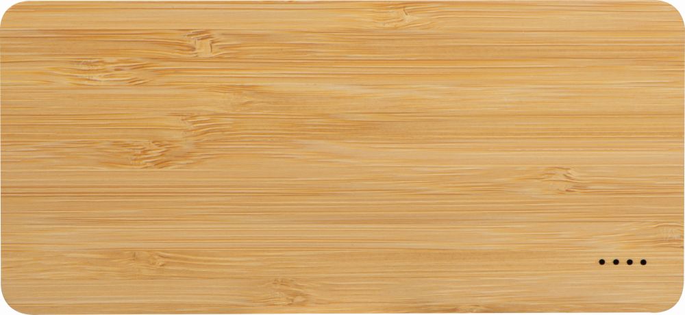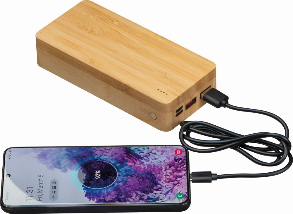 Powerful bamboo power bank with 20,000 mAH / 3.7 V / 74 watts of power. The power bank has a Type C and USB input and is supplied with a Type C quick-charging cable. We will engrave your logo on the powerbank.