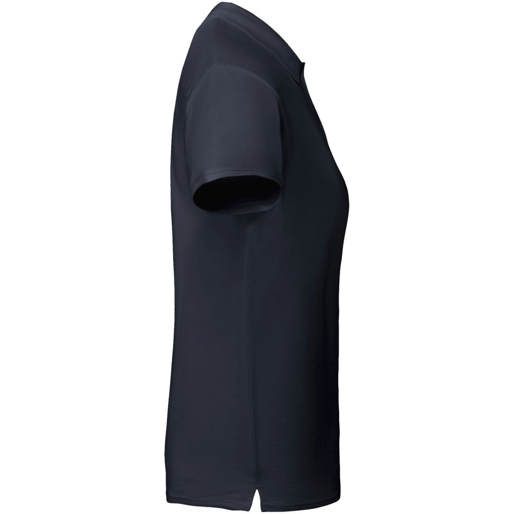 Fitted short-sleeve polo shirt for women in OCS certified organic cotton. 1x1 ribbed collar and sleeve edging. 2-button placket. Reinforced covered seams in collar. Side slits on hem. Removable label. OCS organic fabric. The model is 174 cm and is wearing size S.